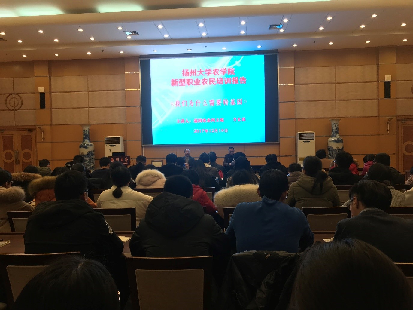 12月18日下午,我室在荷花池校区主楼多功能厅举行了农学院2017年新型职业农民培训,邀请了《财经》杂志环境科技组主编方玄昌老师为我室2015级本科生学员作主题报告。校科技处杨巧林副处长、院党委沙爱红副书记、潘学彪教授等出席了报告会。
