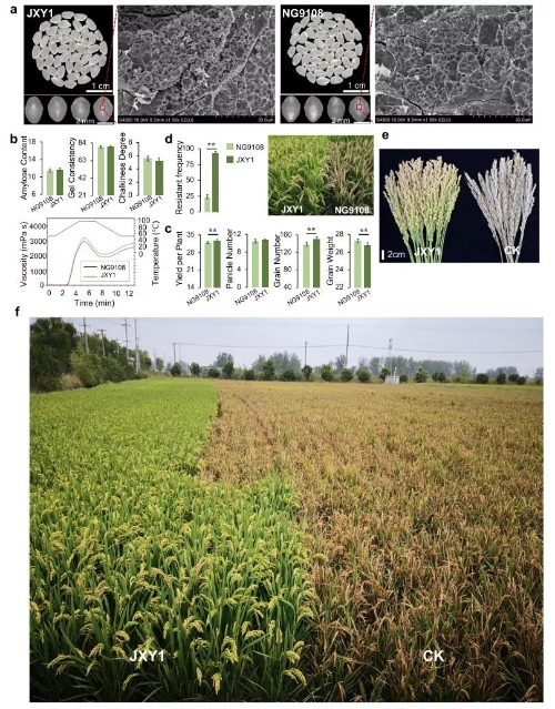 最后基于这些信息,成功地将优良的口感品质和抗稻瘟病等位基因引入到两个高产品种的背景中,并开发了两个优良品系XY99和JXY1,它们具有优良的口感、高产和广谱的抗稻瘟病性。因此,该研究开发了一种新的分子设计育种策略,并缩小了基因组研究与作物育种之间的差距。
