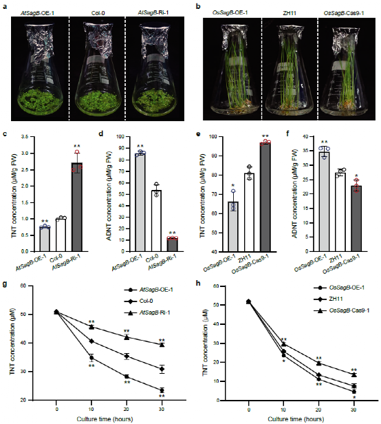 Sag基因编码一种硝基还原酶,本文发现该基因在几乎所有已经被测序的陆生植物(苔藓、蕨类和种子植物)具有同源基因,系统的进化分析发现该基因是陆生植物的祖先物种通过一次水平基因转移(horizontal gene transfer,HGT)获得于细菌。水稻和拟南芥SagB基因的表达受多种芳香族硝基化合物的诱导,包括有爆炸物TNT、天然化合物1-硝基芘(1-NP)和除草剂二甲戊乐灵(Pen);体外的酶活实验表明植物SagB具有降解这些芳香族硝基化合物的能力。
