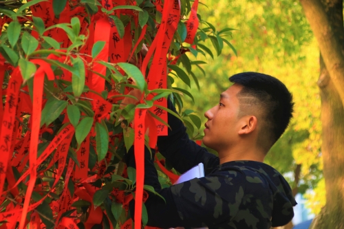 与此同时,我院在校师生还用传统的系红丝带方式来寄予祝福。疫情防控原因,大一新生久久未能回家,他们大多数便写下“父母亲人身体安康,平安喜乐”等节日祝语,还有的对自己的弟弟妹妹送上祝福“预祝转本成功”,也有许多大四的学生“祝愿自己考研顺顺利利上岸!”。“赚钱、脱单、学习进步、家人平安”成了大学生们最普遍的愿景,他们将期盼书写于红丝带上,随即抛系在树上,盼望愿望能够实现。