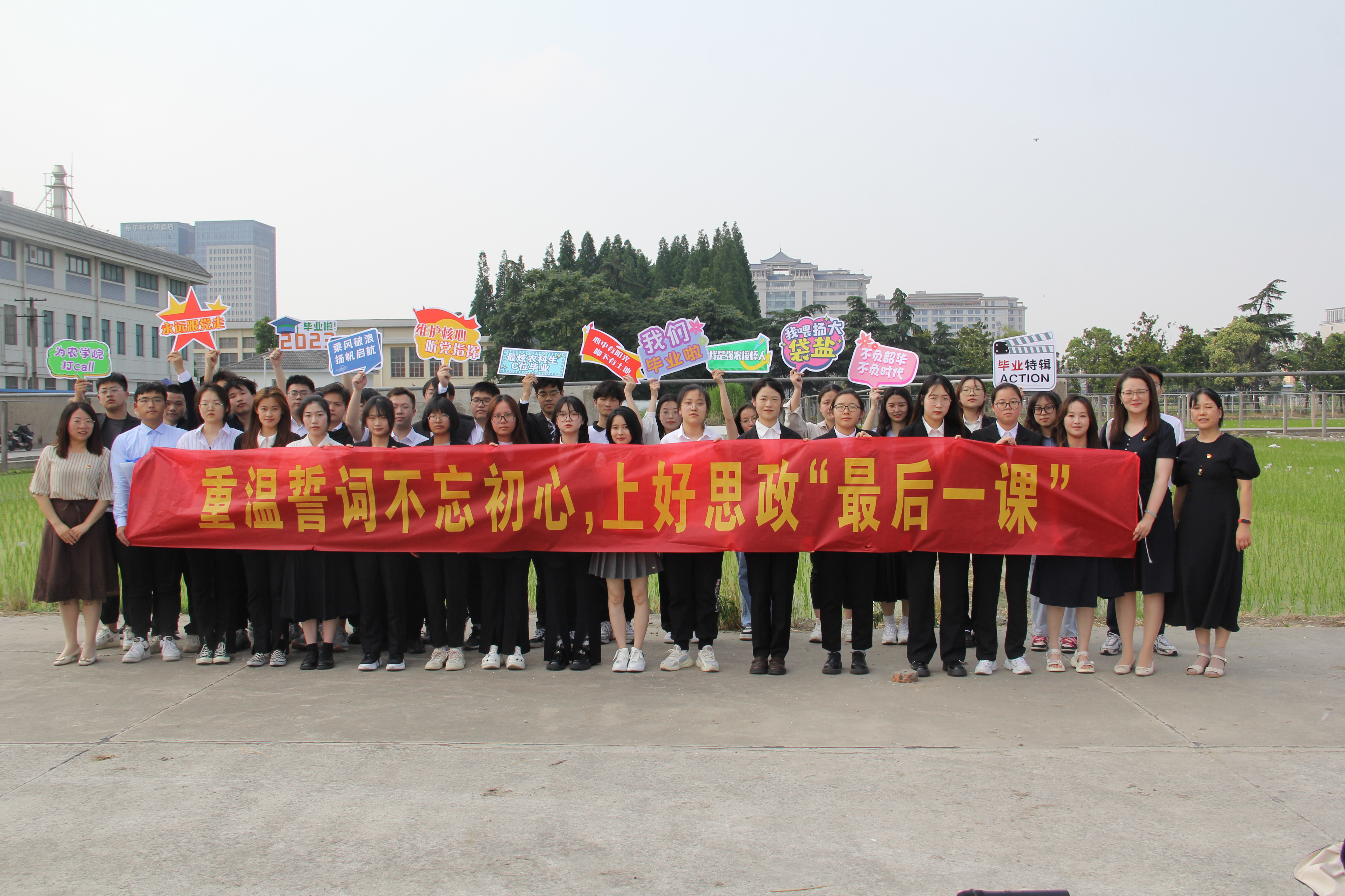 院党委副书记周立云为学院毕业生党员讲授“最后一堂”田间思政课,表达了对大家不舍与期盼,并寄语毕业生牢记习近平总书记的嘱托,志存高远、脚踏实地,把课堂学习和乡村实践紧密结合起来,厚植爱农情怀,练就兴农本领,希望毕业生在乡村振兴的大舞台上建功立业,为加快推进农业农村现代化、全面建设社会主义现代化国家贡献青春力量。