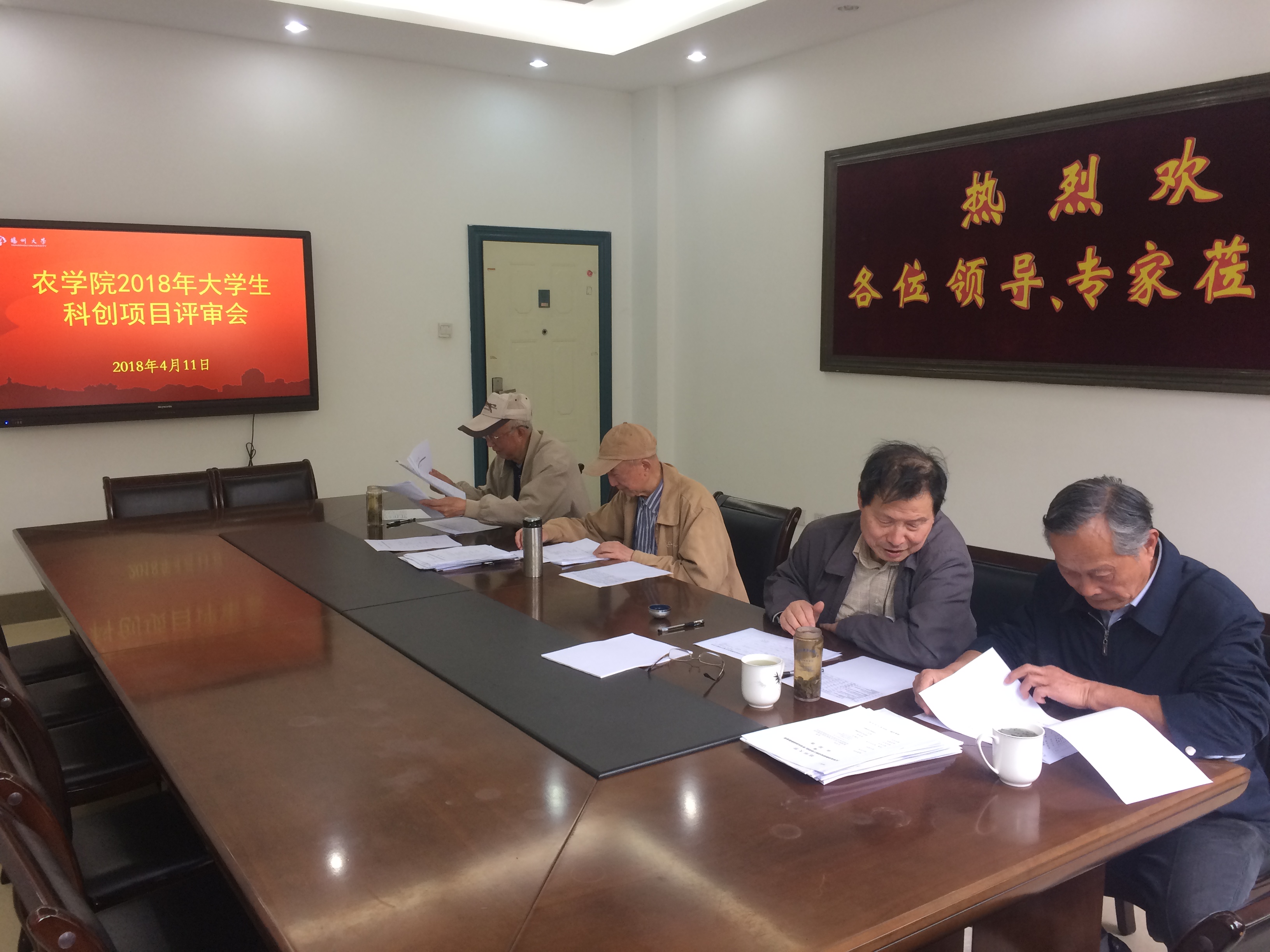 本次推进暨科创项目评审会主要针对2018年全院学生申报的40余项校级科创项目进行评级审阅。四位老教授分别是栽培和育种方面的著名专家,学识渊博,德高望重。专家们对每一份材料都认真查看,逐项过细,不时讨论,对项目的标题和内容都进行仔细地查看,从项目合理可行性、人员配置和结题难度等各方面进行考量。
