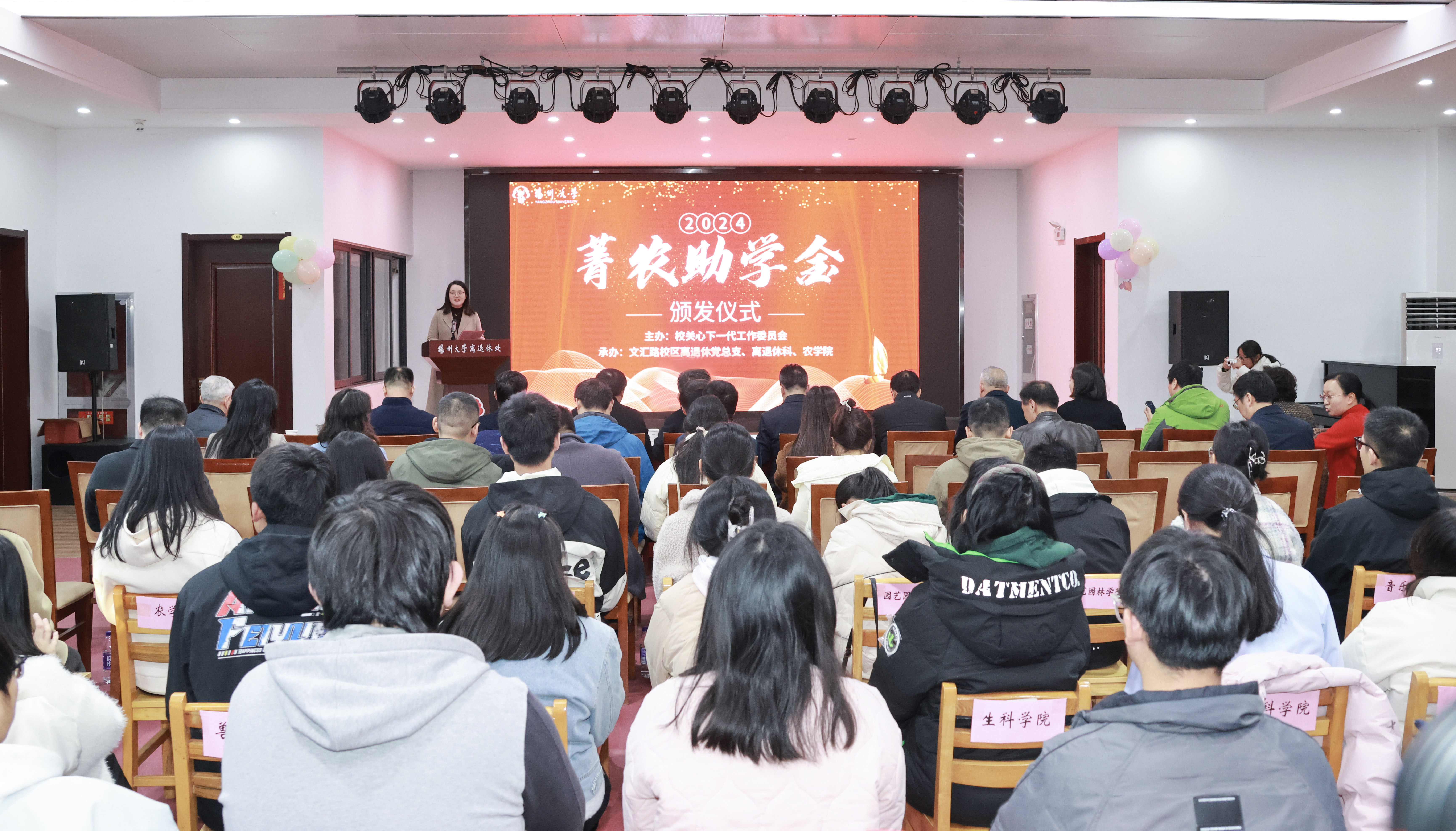 11月27日下午,2024年“菁农助学金”发放仪式在文汇路校区离退休处4楼报告厅举行。校党委副书记、关工委副主任周如军,校关工委常务副主任洪涛,校关工委副主任吴春明,离退休处处长兼党工委书记、校关工委秘书长生永明,校关工委办公室主任兼副秘书长刘汉柏,党委学生工作部(处)副部(处)长毛连军,离退休处副处长兼校关工委副秘书长夏玉荣,文汇路校区各退休党支部书记黄勤、徐静、陈鹏,我院党委书记、学院关工委名誉主任李卫星,受助学院党委副书记、关工委执行秘书及全体菁农助学金受助学生参加发放仪式。仪式由我院党委副书记周立云主持。