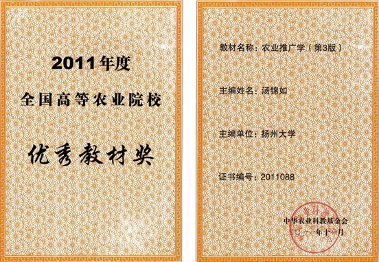 根据中华农业科教基金会《关于公布2011年全国高等农业院校优秀教材及优秀教材建设管理者评奖结果的通知》(农基金[2011] 第10号),我院汤锦如教授主编的《农业推广学》(第3版)获得2011年度全国高等农业院校优秀教材奖。