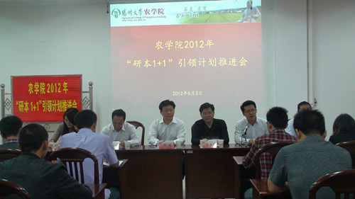 5月3日下午,农学院2012年“研本1+1”引领计划推进会于农牧楼N127隆重召开。校研工部周斌部长、农学院党委生永明副书记、陆建飞副院长、团委佴军书记以及各位团委老师、部分研究生和本科生应邀参加本次会议,会议由农学院团委佴军书记主持。