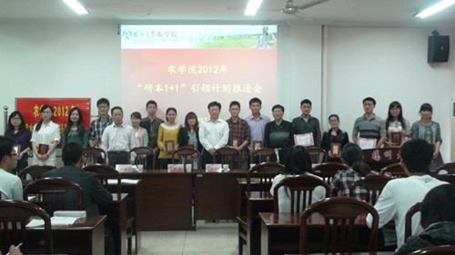 会议伊始,院团委刘艳阳老师在总结农学院2011年“研本1+1”工作开展情况及成果的基础上,对2012年“研本1+1”引领工作做了相应的计划和部署,本年度农学院“研本1+1”引领计划包括“共建引领”、“结对引领”、“岗位引领”及“示范引领”四个部分,主要从思想、学习、科研、工作、生活等方面展开引领,之后,他宣读了农学院2012年“研本1+1”引领计划的结对团体以及个人,并邀请周部长、生书记与陆院长为参与引领计划的研究生颁发聘书。