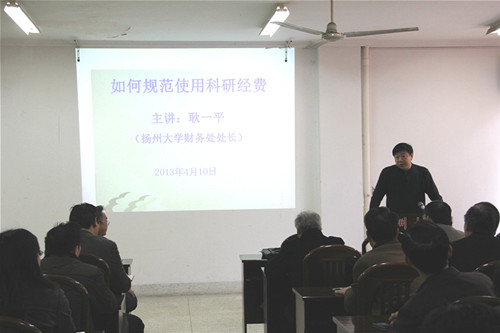 4月10日下午,扬州大学财务处处长耿一平受邀为农学院70余名教职工做报告,耿处长就如何规范使用科研经费这一主题做了详细阐述。