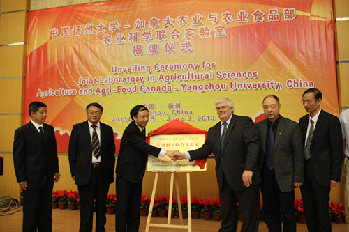 2013年5月,焦新安校长与AAFC科技司司长Komal博士签署了“扬州大学和AAFC合作共建中加农业科学联合实验室”的协议。此次,Gilles Saindon博士是应焦新安校长的邀请来我校为“中国扬州大学和加拿大农业与农业食品部农业科学联合实验室”揭牌的。在扬期间,Gilles Saindon博士还为我院研究生做了题为“中加农业科技合作”的学术报告。