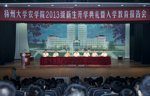 九月的扬州天高气爽、碧空如洗,在迎新工作圆满完成之后,9月3日上午,农学院2013级新生开学典礼暨入学教育报告会在荷花池校区小剧场隆重举行,225位本科生、82名硕士生、17名博士生在此济济一堂。院党委书记郭文善、院长刘巧泉、党委副书记沙爱红、副院长陆建飞、院长助理陈源、高辉及作物遗传育种与应用生物技术系系主任许如根参加典礼并在主席台就坐。院长刘巧泉主持会议,院综合办公室、团委、学工办负责人、全体辅导员及各新生班级班主任一并出席开学典礼。