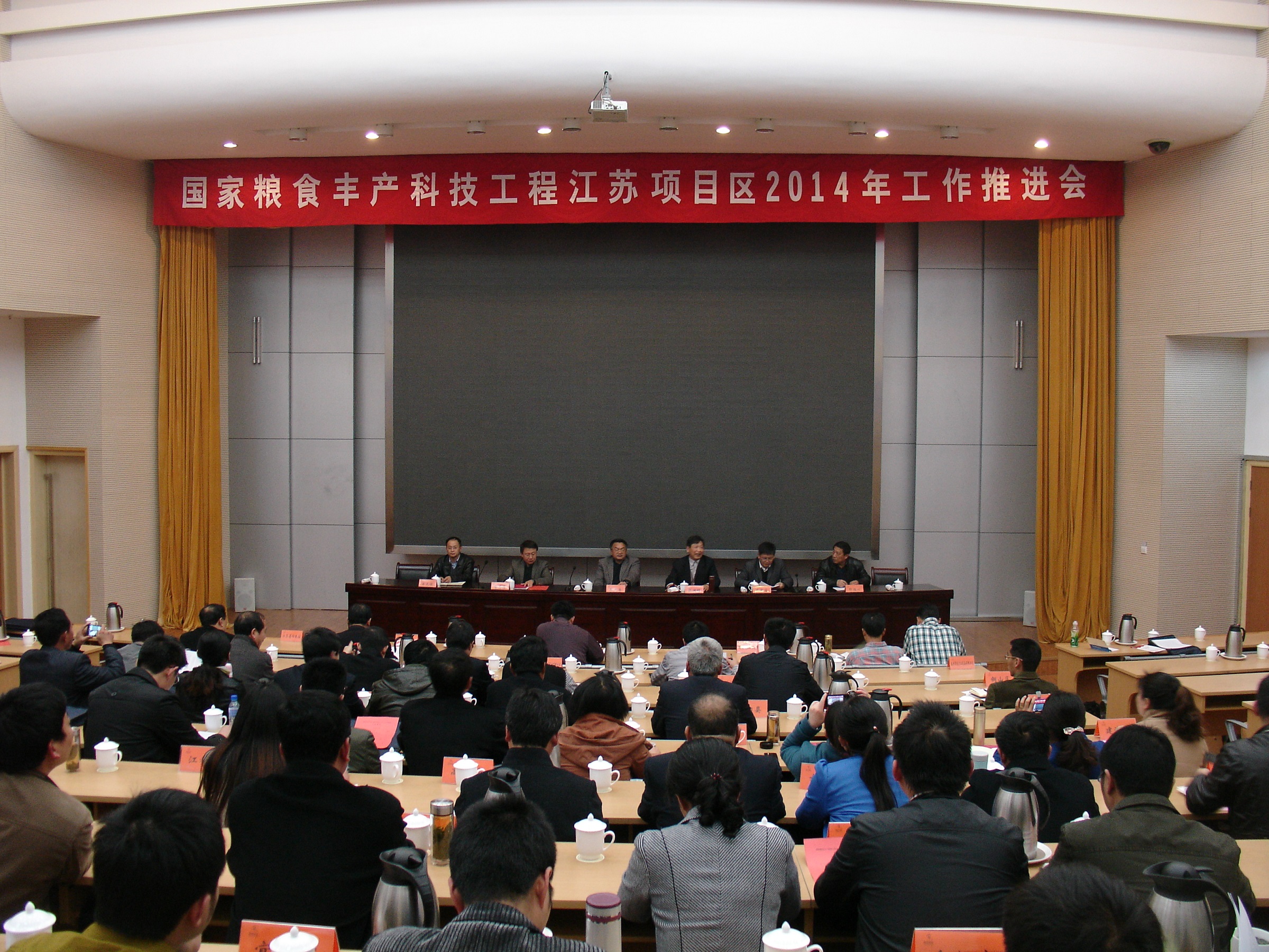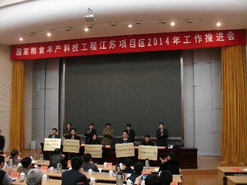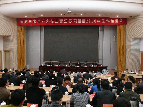 3月27-28日,国家粮食丰产科技工程江苏项目区2014年工作推进会在扬州召开。扬州大学副校长刘祖汉,项目办公室主任、省科技厅农村科技处处长陈洪强,来自扬州大学、南京农业大学、江苏省农科院和江苏省作栽站等课题承担单位与第一、二、三期项目29个实施县(市、区)科技局、农委的领导和专家及有关涉农企业负责人,共90余人参加了本次会议。会议由项目区首席专家张洪程教授主持。