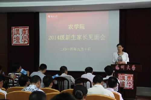 下午2点,学院组织了全体新生家长参观了我院作物遗传生理重点实验室,并在农牧楼N127报告厅举行了“2014级新生家长见面会”。会上,家长们一起观看了学院宣传片,全方位的了解了我院在师资力量、科研成果、学科发展等方面的情况,沙爱红副书记在科创工程、校院资助体系、优本交流项目、校园安全等方面又作了具体补充,并希望家长能够与学院建立会商制度,实现一学期一电话,经常与学院联系,了解学生的现状,合力实现学生的成人成才培养。团委(学工办)老师一并参加了见面会。
