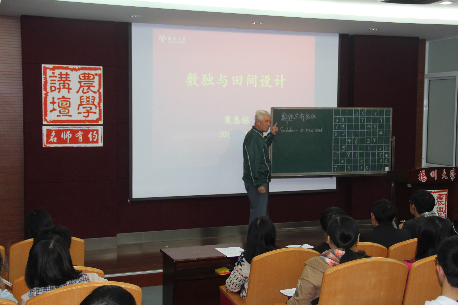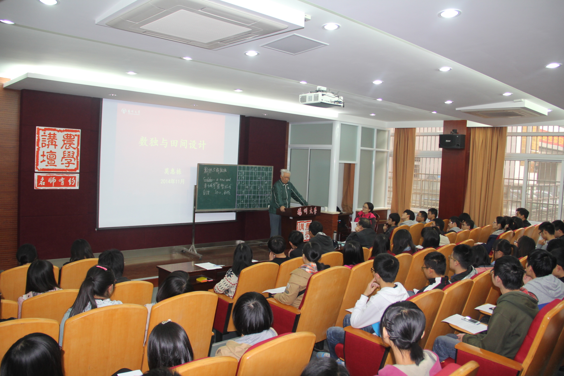 莫老师在退休后,用了7年时间研究“数独”,并将之应用于农业田间试验。2008年,他在《作物学报》发表了一篇学术论文——《田间试验的一种新设计——数独方》。同时,近年他还编撰了数本《数独演练》习题册。本次报告,他以《数独与解数独》为题,从数独的名称由来,发展演变,基本规则和解题技巧等方面向师生们全面介绍了这种风靡世界的逻辑游戏。莫老师还以两道题目为例,向师生们介绍了解数独的四种具体方法。莫老师认为,经常进行数独训练,能使人保持专注,锻炼思维能力,舒缓生活压力,增强个人自信。莫老师严谨认真的治学态度和风趣幽默的语言风格感染了在场的每位听众,会场上不时爆发出阵阵掌声。而就在报告会进行期间,也不断有学生慕名而来,倚门倾听,一睹这位农学大家的风采。报告会在师生们经久不息的掌声中结束。