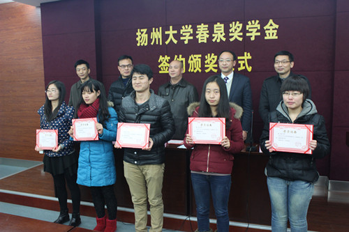 春泉奖学金是扬州春泉科技有限公司秉承“尊重知识、尊重人才”的理念而在我院设立的奖学金项目,每学年三万元,连续五年,用以支持学校教育事业、资助学生学习研究。