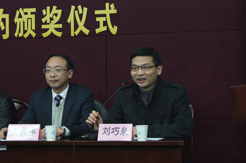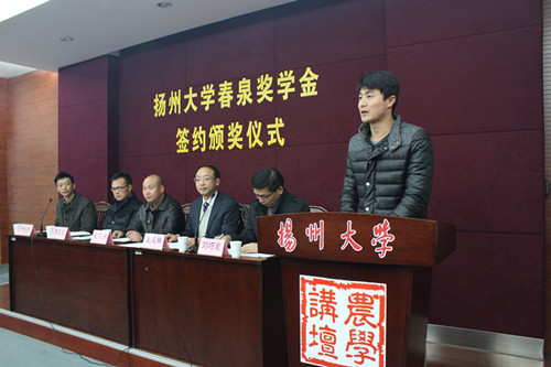 本次仪式由严长杰副院长主持,仪式分为五项议程,第一项议程由春泉科技有限公司总经理花荣浒先生致辞。据他介绍,春泉科技有限公司自1988年成立以来一直致力于农业科技的推广与应用,与我院也有超过二十年的合作历史,本次设立春泉奖学金旨在激励农学学子努力学习,为国家农业发展做贡献。第二项议程由校对外联络办王庆林主任与花荣浒总经理签订捐赠协议,并为花总颁发了捐赠荣誉证书。随后,由主席台就坐的各位领导向首批十位春泉奖学金获得者颁发获奖证书,获奖学生代表邓乐乐同学上台进行了发言。最后一项议程分别由校院领导讲话,王庆林主任和李卫星副处长先后代表学校与校学生处发言,他们在讲话中表达了对春泉科技有限公司的感谢和对农院学子的鼓励,并期待着校企双方的进一步深度合作。在刘巧泉院长发表的讲话中,除一并表示感谢以外,他还对在座的14级学生提出要求,希望同学们努力学习,全面成才,感恩社会,奉献农业事业。至此,签约颁奖仪式结束。