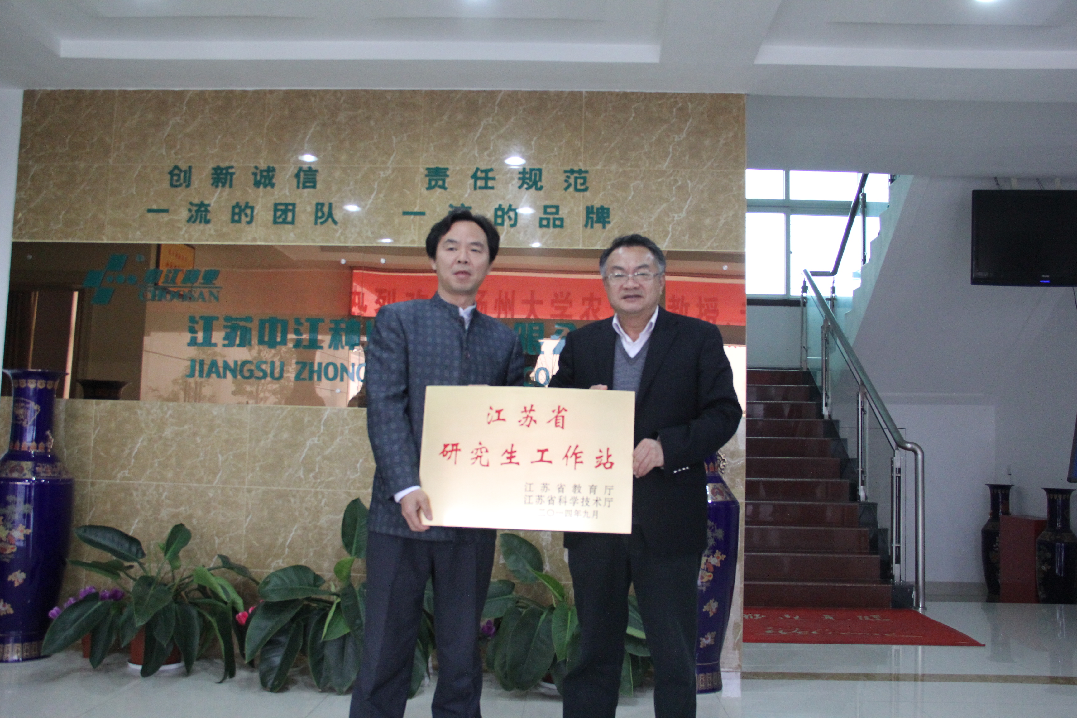 当天下午,郭文善书记、蒋红云总经理为我院江苏省研究生工作站揭牌并挂牌。郭文善书记表示学院将以建立研究生工作站为契机,加强与中江种业的合作,秉着真诚、诚信、互助、共赢的原则,推进双方的共同发展。