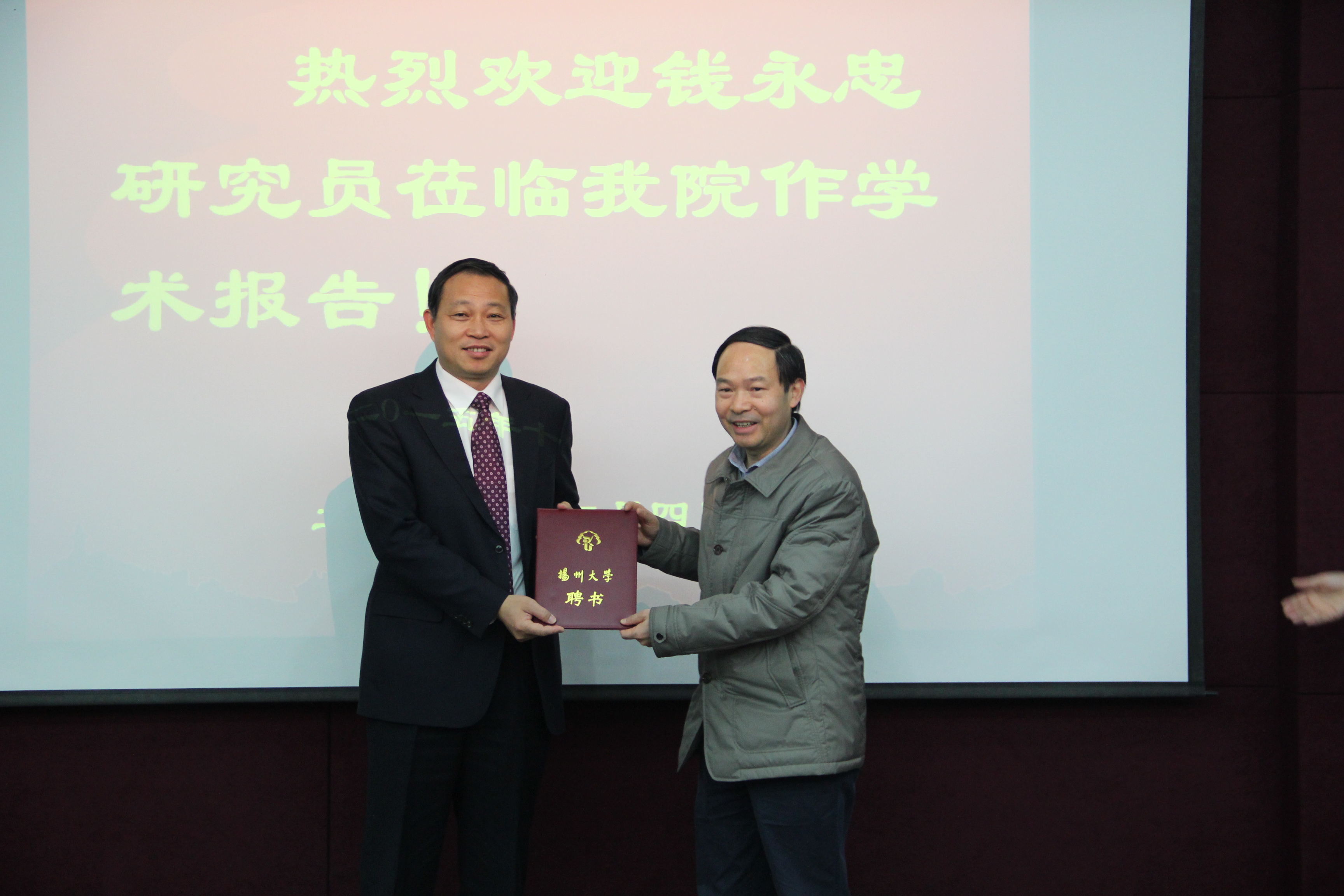 12月4日上午,扬州大学兼职教授聘任仪式在农学院学术报告厅举行。中国农业科学院农业质量标准与检测技术研究所所长、农业部农产品质量标准研究中心主任、农学院86届院友钱永忠研究员受聘为我校兼职教授。校长焦新安教授出席聘任仪式。焦校长为钱永忠研究员颁发了扬州大学兼职教授聘书,并亲自为钱永忠校友戴上校友徽章。