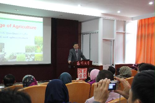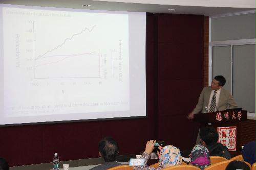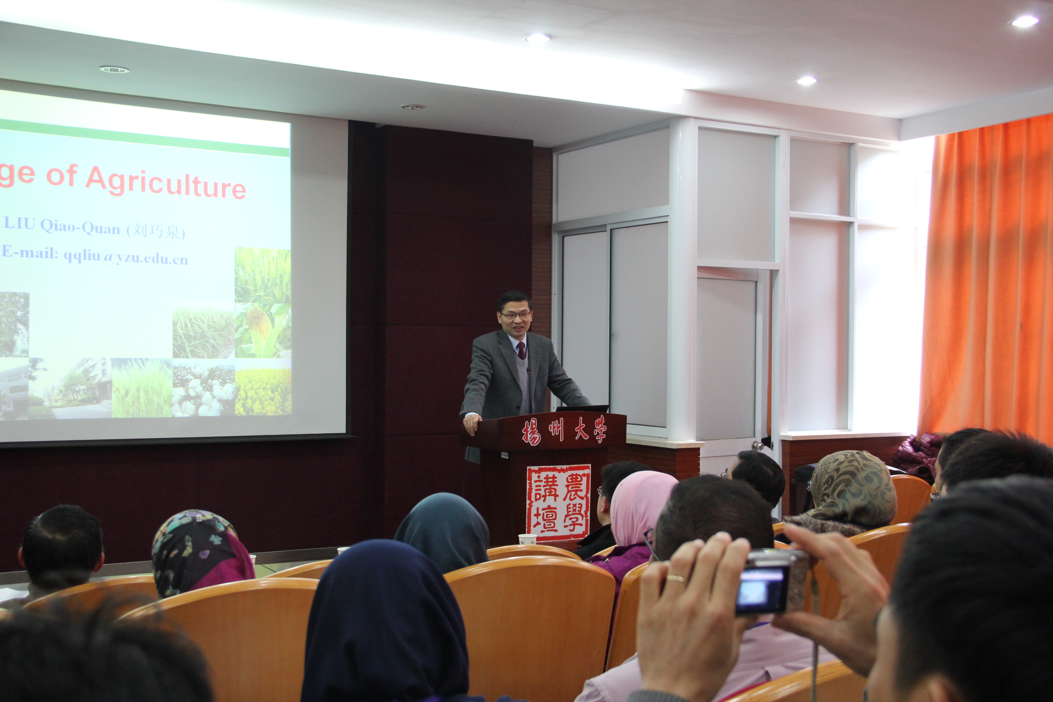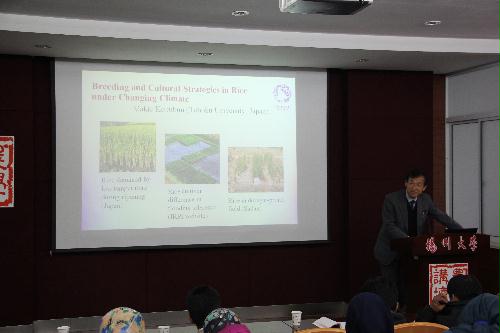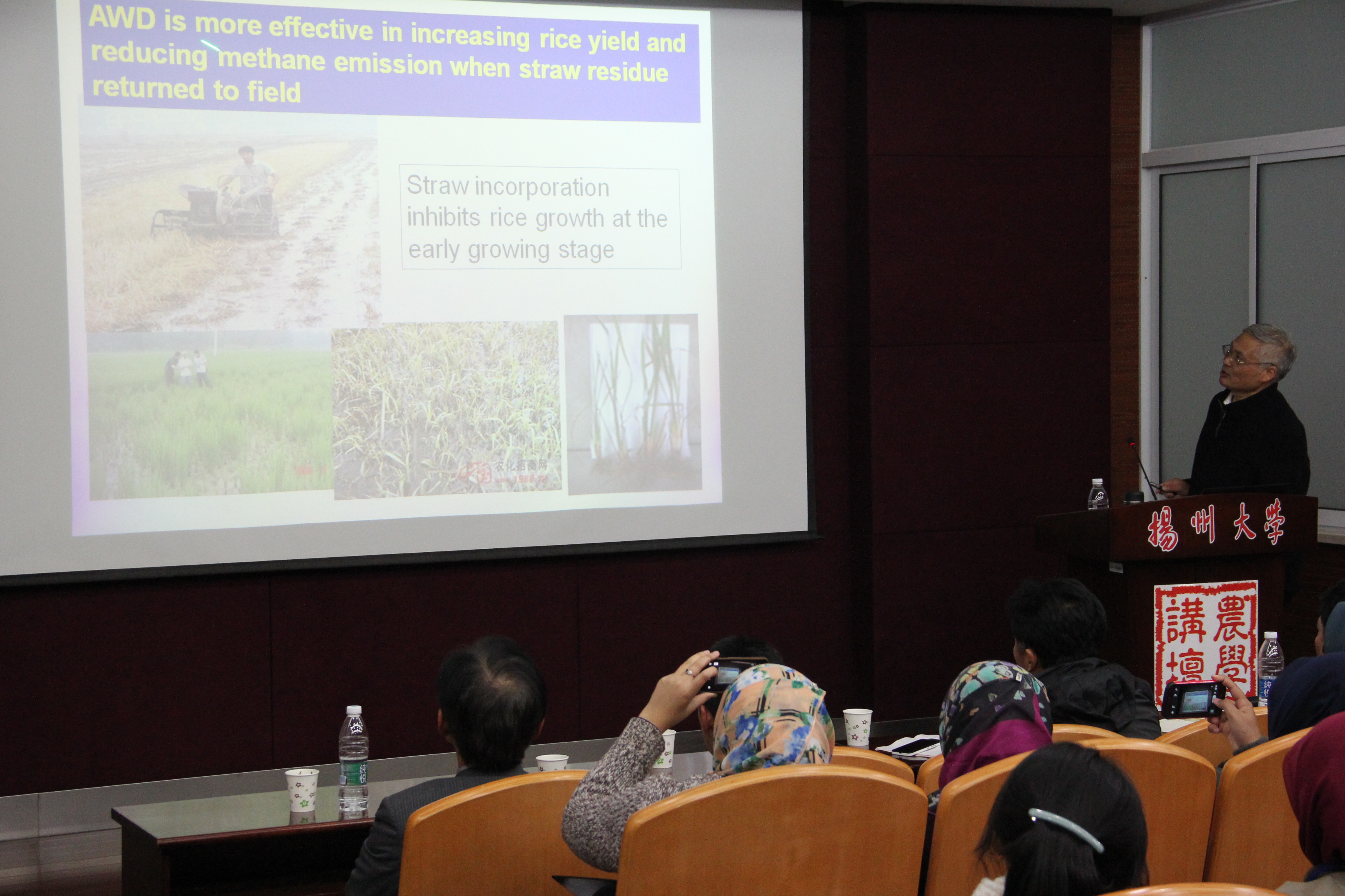 12月6日上午,该培训班在农学院举行开班仪式。来自柬埔寨、印度尼西亚、马来西亚、菲律宾、泰国、缅甸、越南等8个东盟国家的38名学员参加本次培训。“东盟-中日韩(10+3)水稻现代化生产与分子育种技术研讨会暨高级人才培训班”项目负责人、农学院院长刘巧泉教授、海外教育学院副院长赵海涛等相关负责同志出席开班仪式,周桂生教授主持开班仪式。开班当日下午,来自日本东北大学的Kokubun Makie教授、Homma Koki教授以及农学院杨建昌教授分别为学员们作了题为“Breeding and Cultural Strategies in Rice under Changing Climate”,“Climate change impact on rice production in Asia”,“Grain filling and alternate wetting and drying irrigation in rice”的学术报告。本次活动将通过专家讲授、班级研讨、实地考察等形式开展为期21天的研讨和培训。