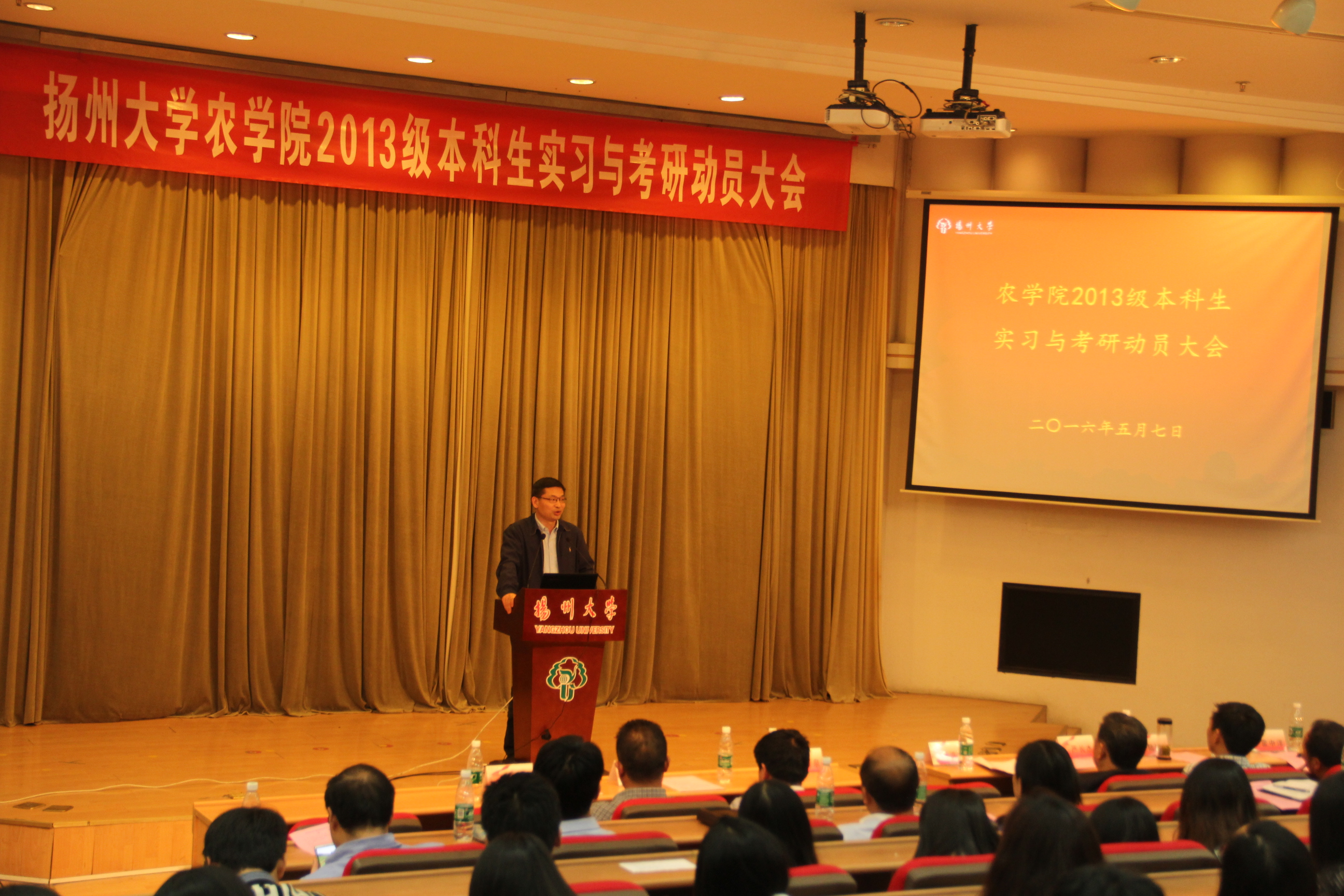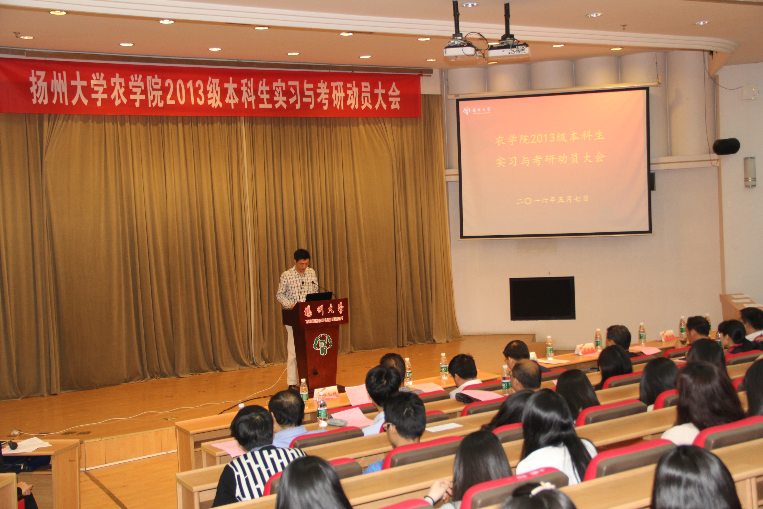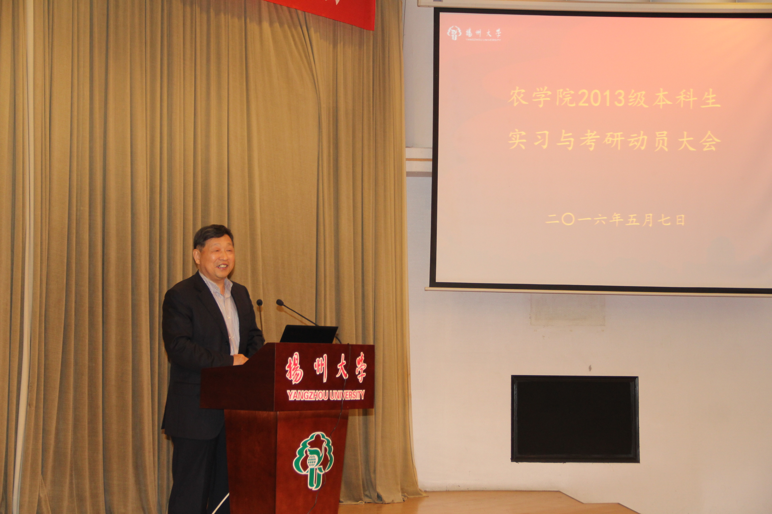 5月7日上午,我院在逸夫图书馆报告厅召开2013级本科生实习与考研动员大会。中国工程院院士、作物栽培学与耕作学学科带头人张洪程教授、刘巧泉院长、沙爱红副书记、严长杰副院长、作物遗传育种与应用生物系主任许如根教授、作物遗传育种学科带头人梁国华研究员、区域农业发展学科带头人陆建飞教授、农学系副主任霍中洋教授等出席会议。院团委(学工办)全体老师和2012、2013级班主任以及全体2013级本科生共同参加了本次大会。