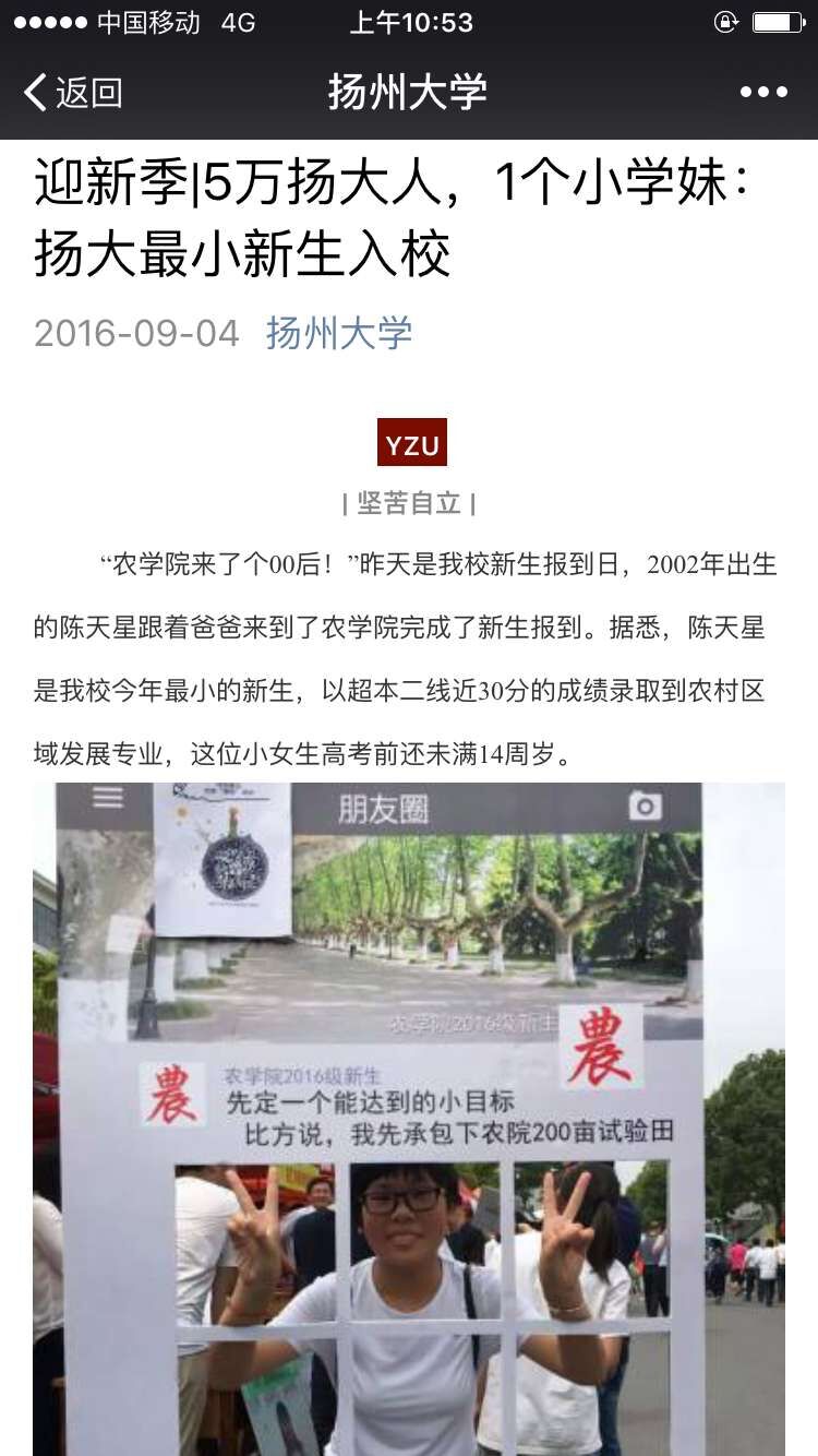 在9月3日新生报到日,我院迎来了今年的“扬大最小新生”——2002年7月出生的14岁宿迁女孩陈天星同学。今年高考,陈天星同学总分超过本二线近30分的成绩被我院农村区域发展专业录取。在迎新现场,校院领导和陈天星同学亲切交流,希望她尽快适应大学生活,在学业上更进一步。扬子晚报、现代快报、扬州晚报、扬州大学官方微信、扬州大学新闻网等校内外媒体竞相报道了陈天星同学的相关情况。