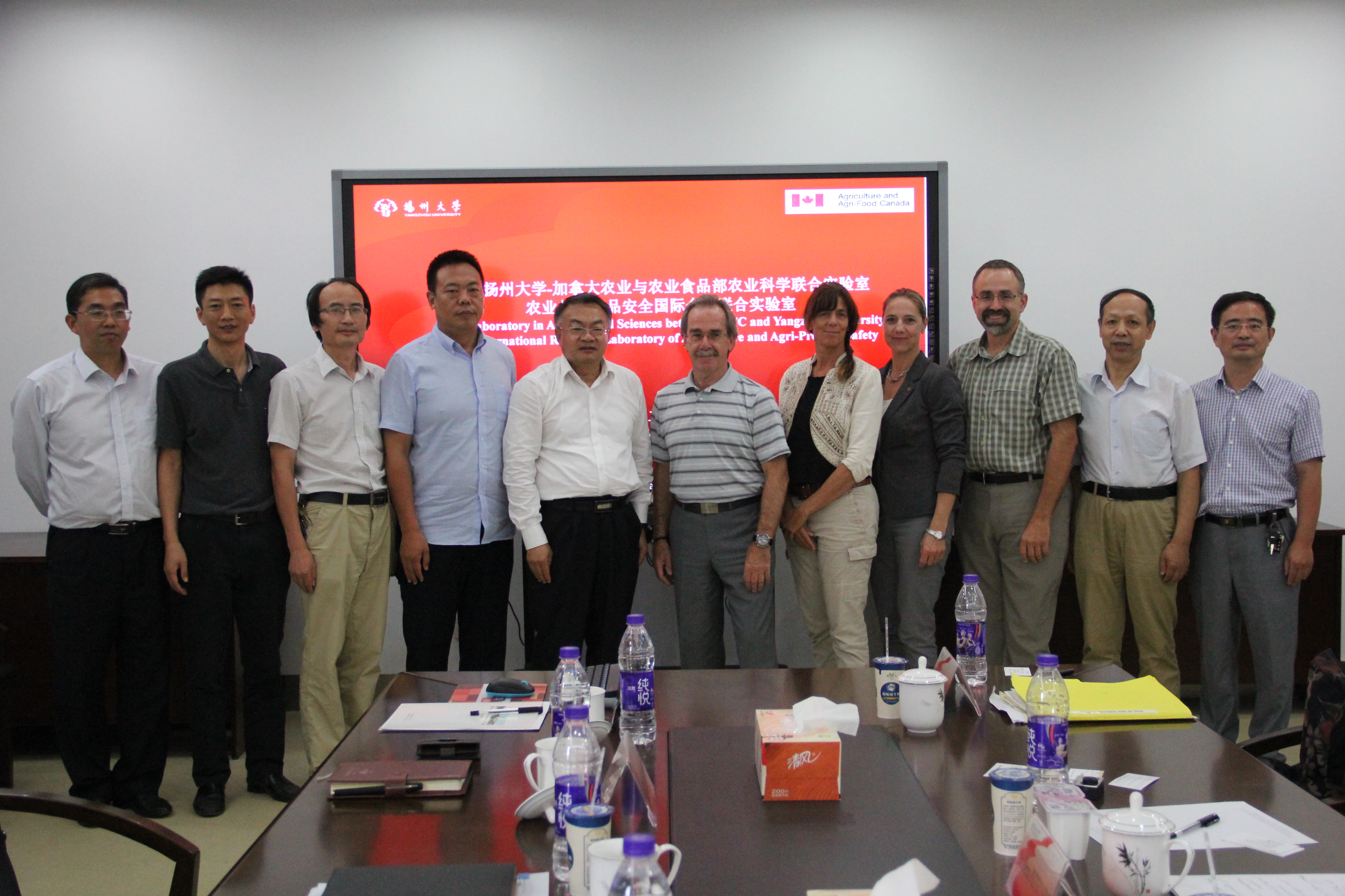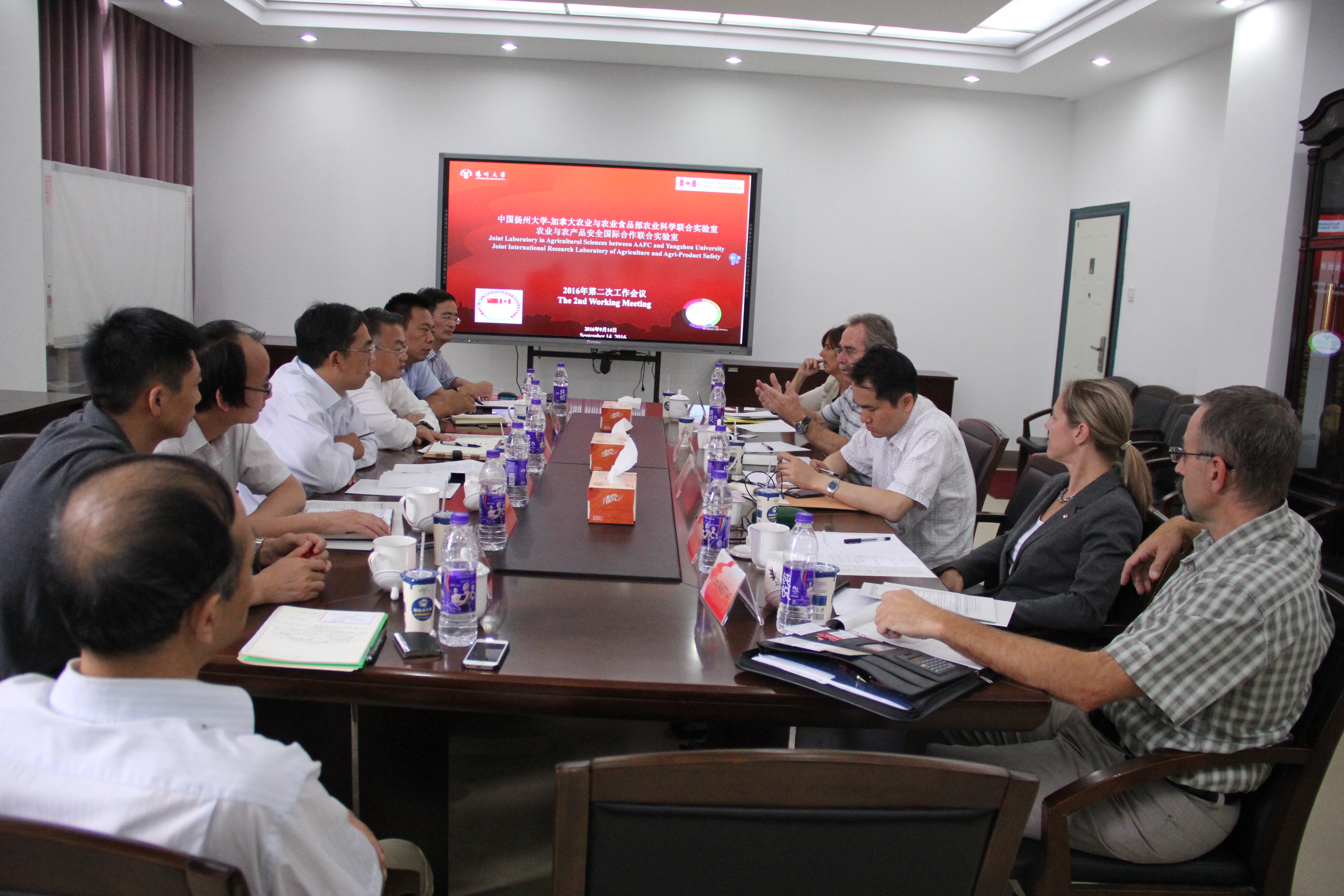 2016年9月14日,扬州大学—加拿大农业与农业食品部农业科学联合实验室暨教育部农业与农产品安全国际合作联合实验室2016年第二次中加双边工作会议在我院举行。加拿大农业与农业食品部科学技术司司长Dr. Denis Petitclerc、魁北克研发中心科学主任Dr. Annick Bertrand和研究科学家Dr. Annie Claessens、SeCan种子公司高级经理Trent Whiting先生,我院党委书记郭文善教授、副院长严长杰教授、动科学院院长杨章平教授、农业科技发展研究院(国际合作联合实验室)曹永忠、周桂生副院长、实验农牧场陈后庆副场长等出席了会议,校长焦新安教授亲切会见了加方客人。