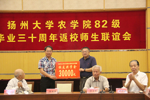 在座谈会上,焦新安校长向校友们介绍了扬州大学在学科建设、人才培养、校友合作等方面的近几年取得的成就,让校友们都为母校自豪。焦校长对校友们长期对学校的支持表示感谢,对校友们取得的成绩表示祝贺,并希望校友们持续关心支持扬大事业,促进融合发展,为早日建成国际有影响的综合性大学而共同努力。农学院党委书记郭文善介绍学院近几年快速发展所取得的成绩,希望校友们常回家看看,加强合作交流,共赢农学院的美好未来。校友代表回顾30年来各自成长过程,深切感恩母校、母院的培育之情。农学院一些老领导和老师也寄语校友们,祝校友们家庭、身体、政治健康。在座谈会上,农学86届校友捐赠了3万元作为“校友奖学金”给学院奖励优秀学子。