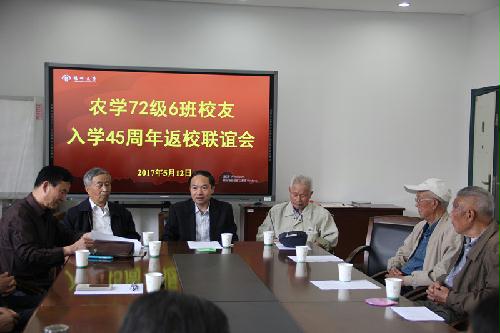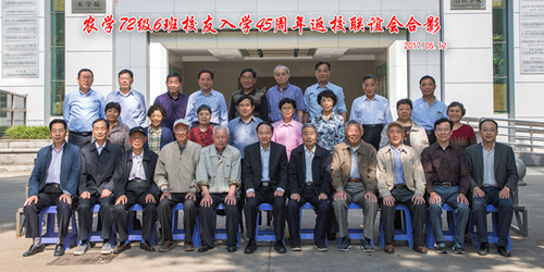 2017年5月12日下午,农学院农学72级6班27位校友在农学院N112会议室举行入学45周年返校联谊活动,校长焦新安,原校党委副书记梁隆圣,原校党委常委、纪委书记严华海,校友总会秘书长王庆林,农学院副院长陈源等领导,教师代表黄启贤、曹显祖、王松山、彭永欣、朱庆森、封福如应邀出席师生联谊会,并与校友们合影留念。联谊会由校友马文辉主持。