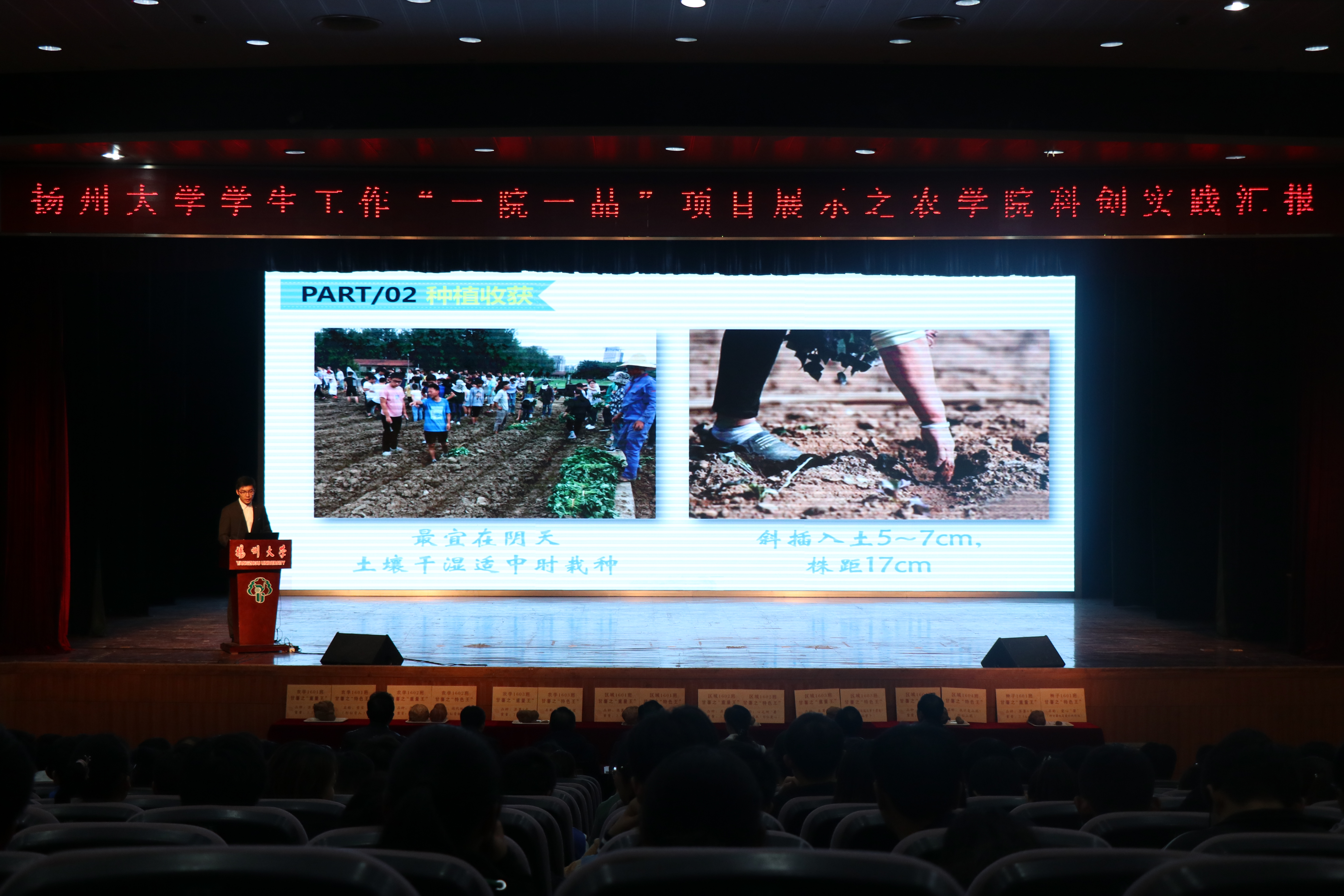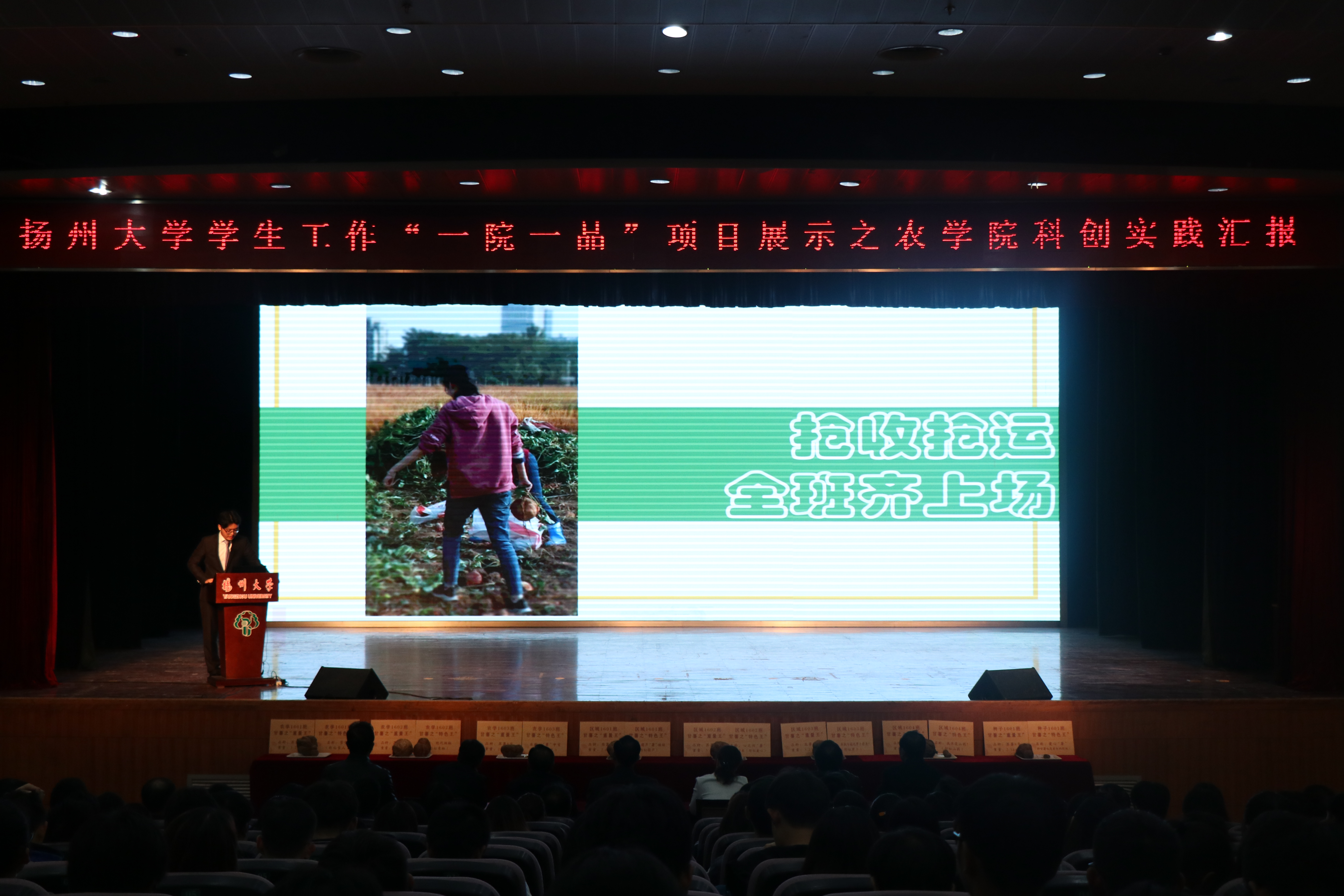 整场汇报,各班级的发挥都十分出色,得分非常接近。最终,农学1603班获得特等奖;农学1601班获得一等奖;种子1601班、区域1603班、区域1602班获得二等奖;农学1602班、区域1604班、区域1601班获得三等奖。同时区域1602班推荐的甘薯以3.45kg重量获得“农院甘薯王”的称号。评委嘉宾及现场的老师为获奖班级颁发了奖牌。