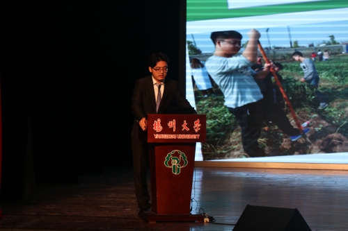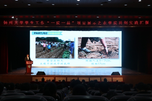 在第一环节的大田实践成果展示之甘薯总结汇报中,我院16级本科生班级代表依次上台,向在场的师生们汇报展示了他们大田实践中体会到的整地的不易、播种的精细、管理的耐心和收获、销售的喜悦。汇报之后,许如根老师对全体学生就专业实践方面提出了期望和要求。在第二环节的技创新实践心路分享中,王俊和李相伯同学作为本科生创新创业和学术科研代表,分别以《弄潮创青春 奉献新时代》和《挑战自我 兴趣学农》为主题,用他们自己的心路历程以及成长之路感染了现场每一位师生。