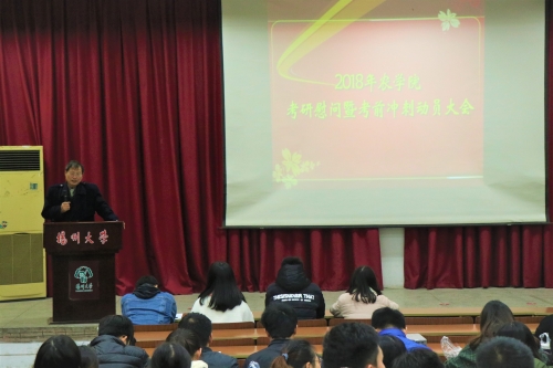 为坚定考研备考同学信念,助力我院2015级学生金榜题名,12月4日下午,我院在科技报告厅召开2018年考研慰问暨考前冲刺动员大会。院党委副书记沙爱红老师,考研基地班负责人黄祖六老师,学工办辅导员老师以及近200名2015级考研学子参加了会议。