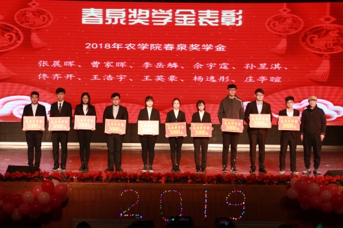 首先,严长杰院长给全体师生致以新年的祝福和良好的祝愿,回顾了学院2018年取得的成绩和荣誉,并对2019年我院的发展表达了无限的期许与真诚的祝愿。接着,颁奖嘉宾分别从“创新创业”、“体育竞技”、“先锋榜样”、“春泉奖学金”以及“班团文化”五个方面向2018年我院老师和同学们获得的各级各类奖项进行表彰,随后农学1501班的袁伟同学进行了个人诗集《栽种春光》的赠书及售书所得捐赠仪式,在场同学深受鼓舞。