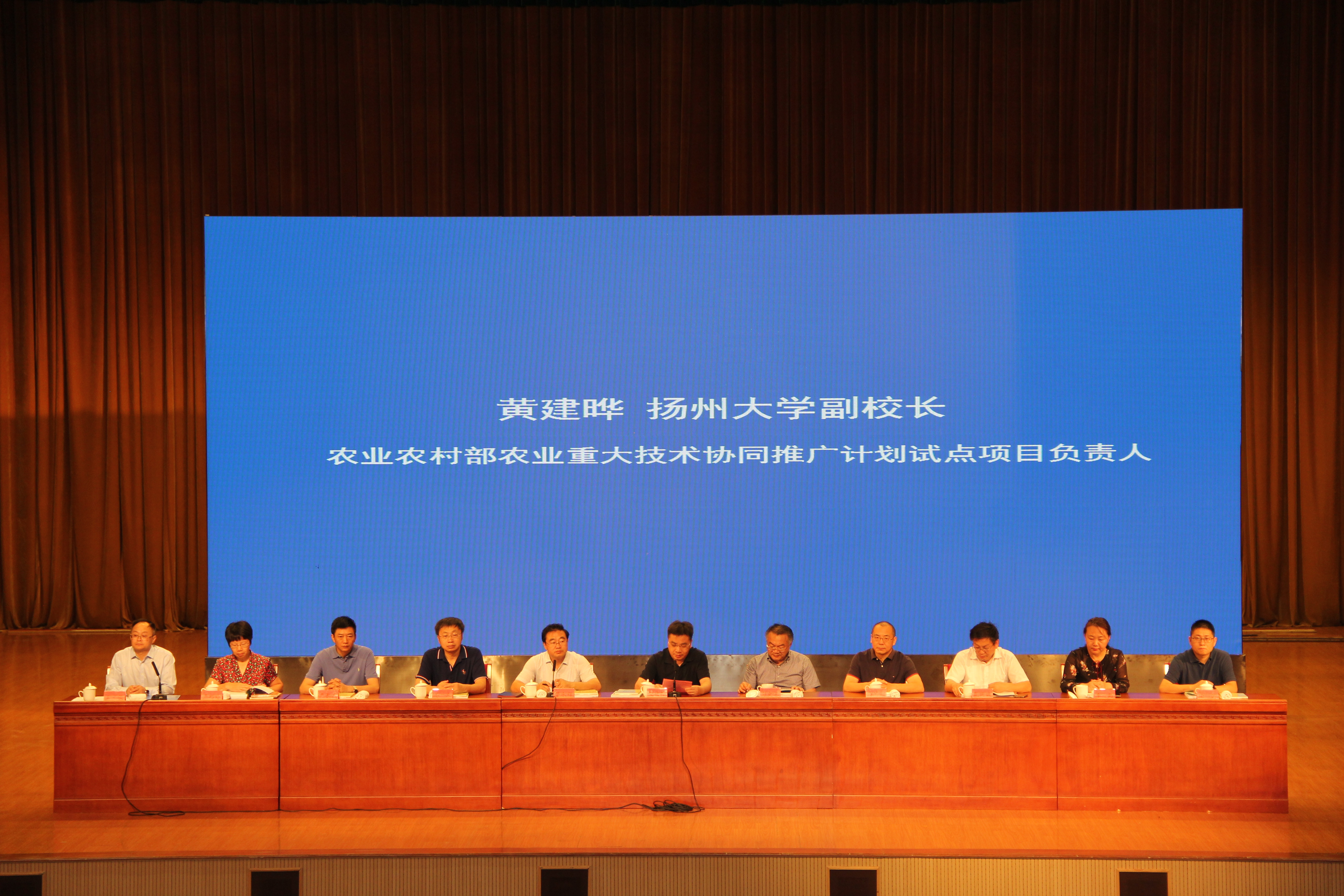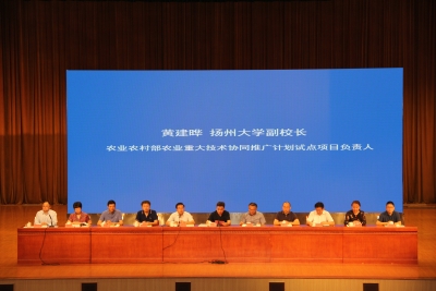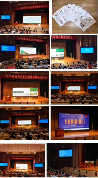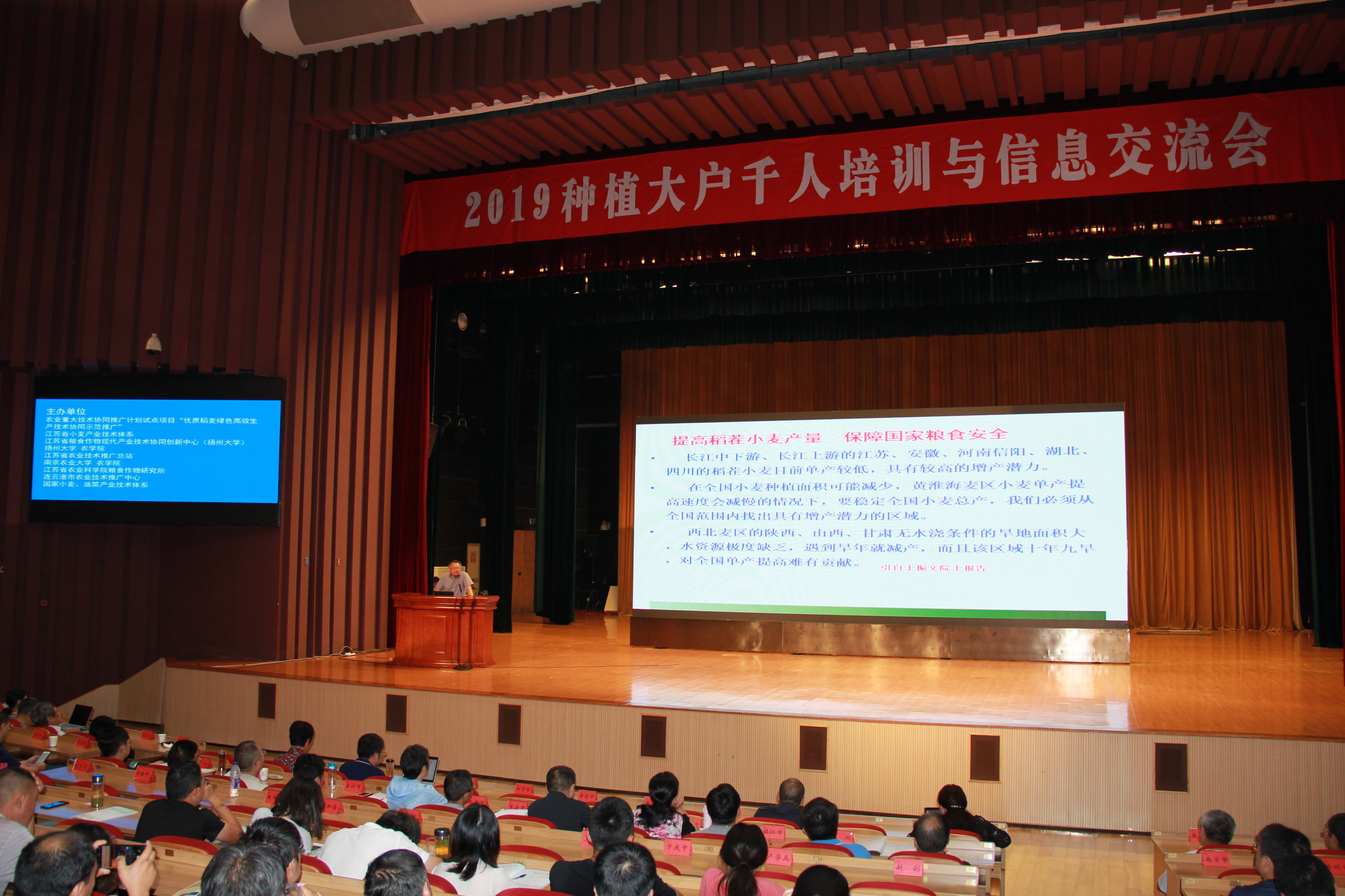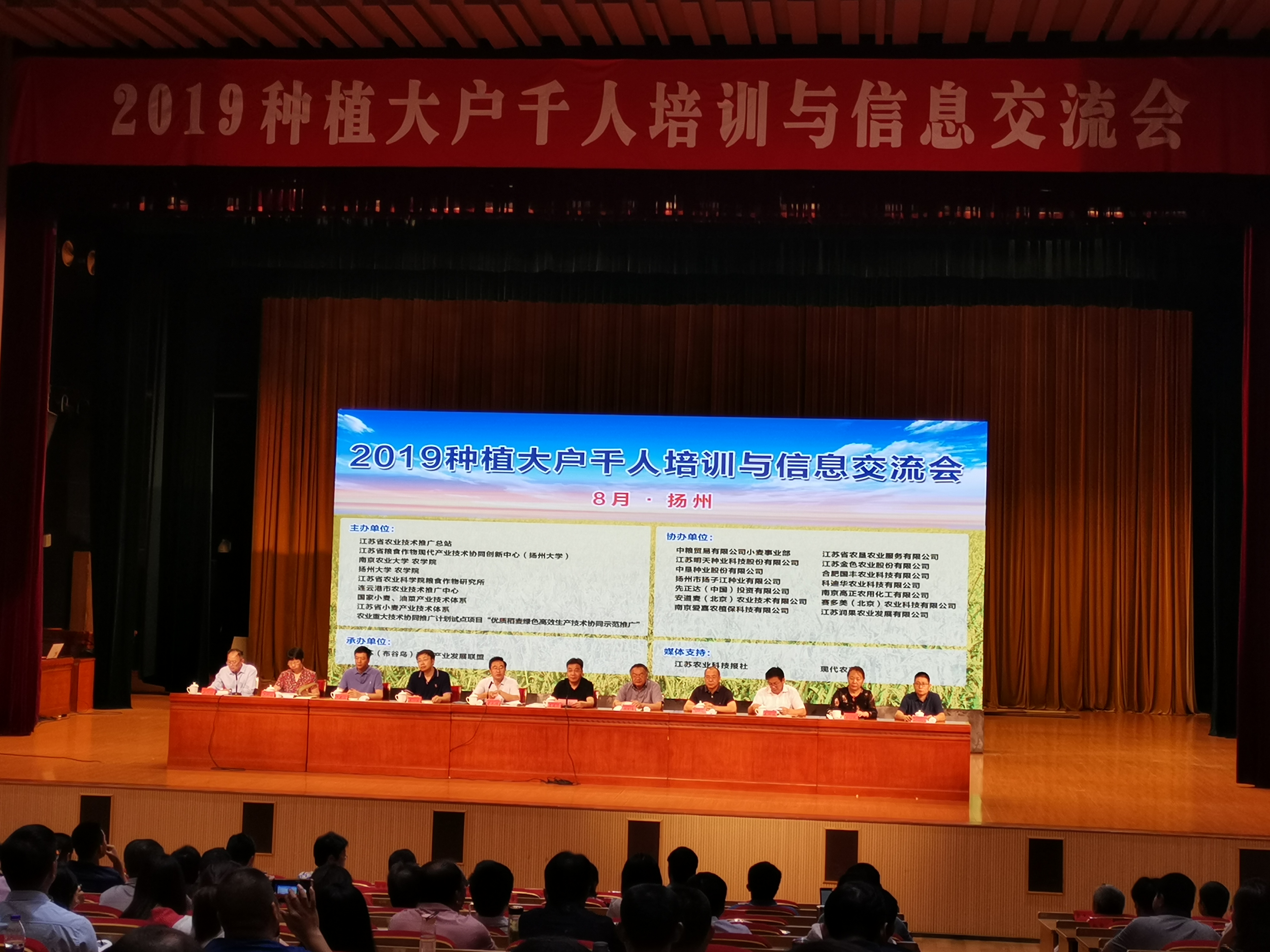 为深入贯彻落实“不忘初心、牢记使命”主题教育的宗旨,扩大我校承担的农业重大技术协同推广计划试点项目“优质稻麦绿色高效生产技术协同示范推广”的协同推广技术成果的影响,2019年8月21日至22日由项目承担单位与协同单位江苏省农业技术推广总站、扬州大学农学院、南京农业大学农学院、江苏省农科院粮食作物研究所、连云港市农业技术推广中心、江苏省粮食作物现代产业技术协同创新中心、江苏省小麦产业技术体系等主办,江苏(布谷鸟)种植产业发展联盟承办,10多家企业协办与媒体支持的“2019种植大户千人培训与信息交流会”在扬州顺利召开。项目负责人、扬州大学副校长黄建晔教授,江苏省农业技术推广总站站长管永祥,项目专家组顾问、农业农村部小麦专家指导组组长郭文善教授,项目推广首席、江苏省农业技术推广总站王龙俊研究员,项目科研首席、扬州大学朱新开教授,项目部分专家组成员,省内地级市农技推广部门领导与技术骨干、实施市县技术人员,来自江苏、安徽的近千名种植大户代表,与小麦、水稻相关的种子、农药、肥料、加工、市场、贸易、图书出版等企业的代表以及新闻单位的代表共1000多人参加了培训会。