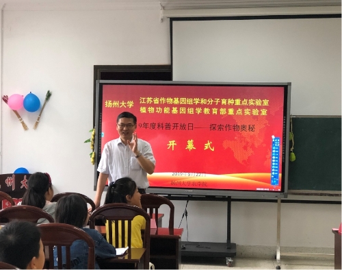 2019年9月22日,江苏省作物基因组学和分子育种重点实验室以及植物功能基因组学教育部重点实验室于扬州大学文汇路校区主办了2019年度科普开放日——探索作物奥秘主题活动。此次活动针对三至六年级小学生开设,共有34名同学参与活动。本次活动旨在加强中小学知识,传承农学精神,培养思想进步、全面发展的高素质人才。本次科普开放日活动主要通过标本室及实验室参观、DNA模型搭建,观看农业科普纪录片、农作物及其产品观察与品鉴、科普知识讲座等环节带领小学生认识农业、了解作物、初识科研。