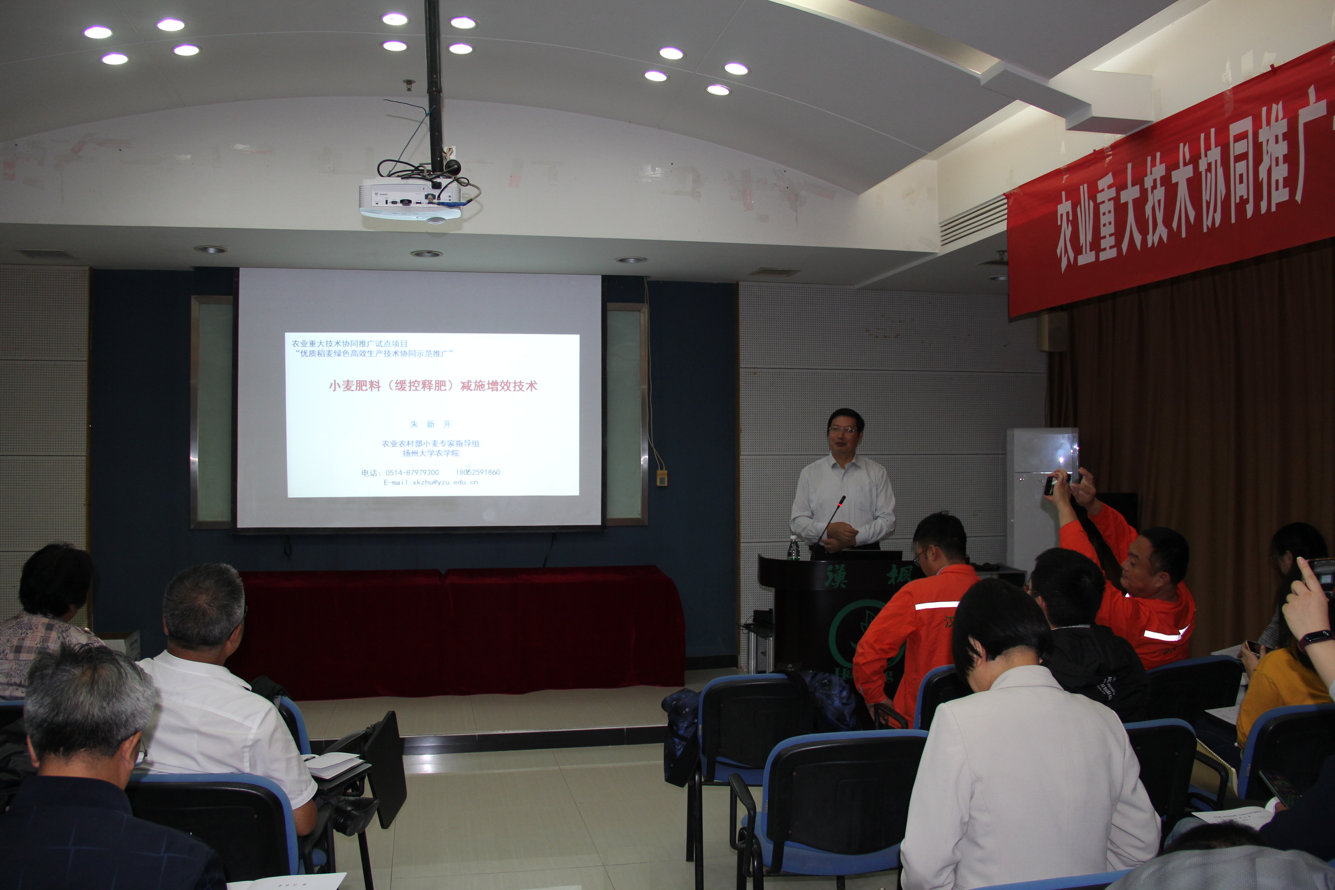 围绕国家作物绿色高质高效安全生产、减肥减药等政策要求,项目协同单位南京农业大学董立尧教授应邀做了“我国稻麦轮作区小麦田杂草减药防除技术”报告,项目科研首席扬州大学朱新开教授做了“小麦肥料(缓控释肥)减施增效技术”的报告,汉枫缓释肥料(江苏)有限公司副总经理李天兵应邀做了“汉枫缓释肥产品及稻麦示范应用情况”专题报告,围绕2019年度小麦生产过程中草害发生偏重、施肥量偏高、施用方式不合理等情况,有针对性的提出了相应技术对策,与基层农业技术人员、基地大户和农场主分享。