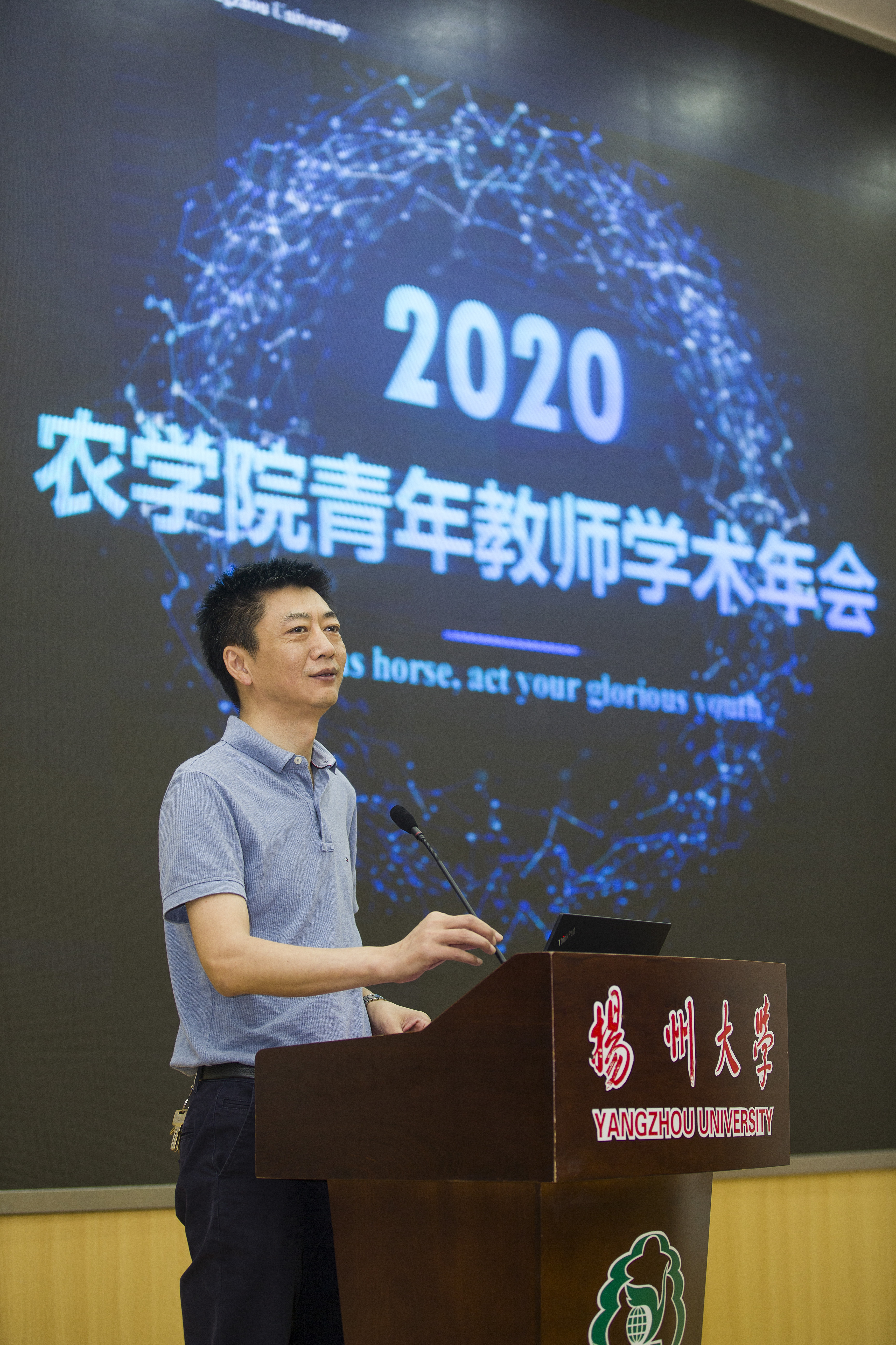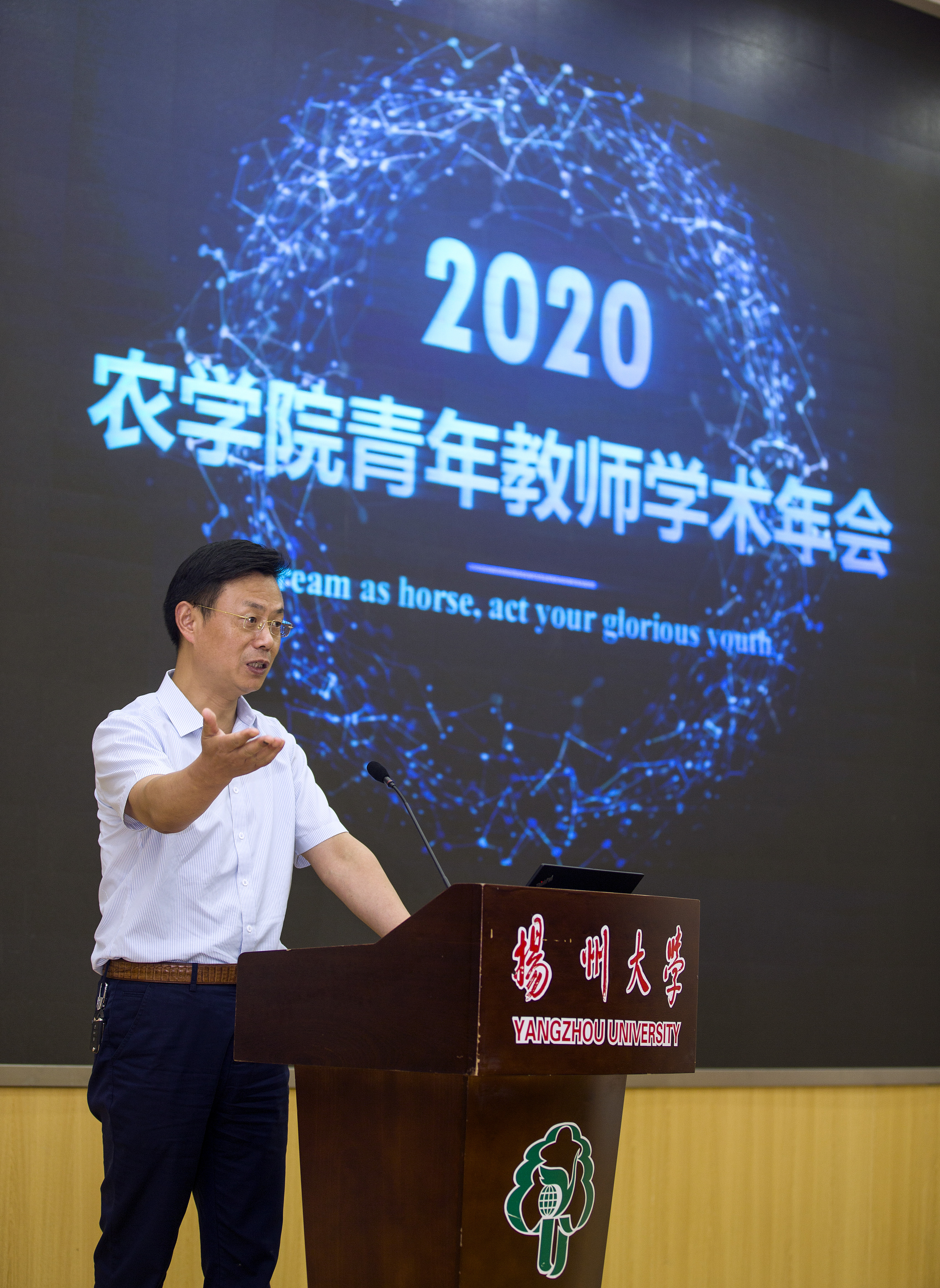 7月10日,农学院2020年青年教师学术年会在荷花池校区逸夫馆报告厅隆重举行。院长严长杰、院党委常务副书记(正处长级)王军、院党委副书记陆江峰、副院长高辉、以及全院教职工参加了年会。受疫情影响,院260余位研究生通过腾讯会议直播方式全程观看了年会。