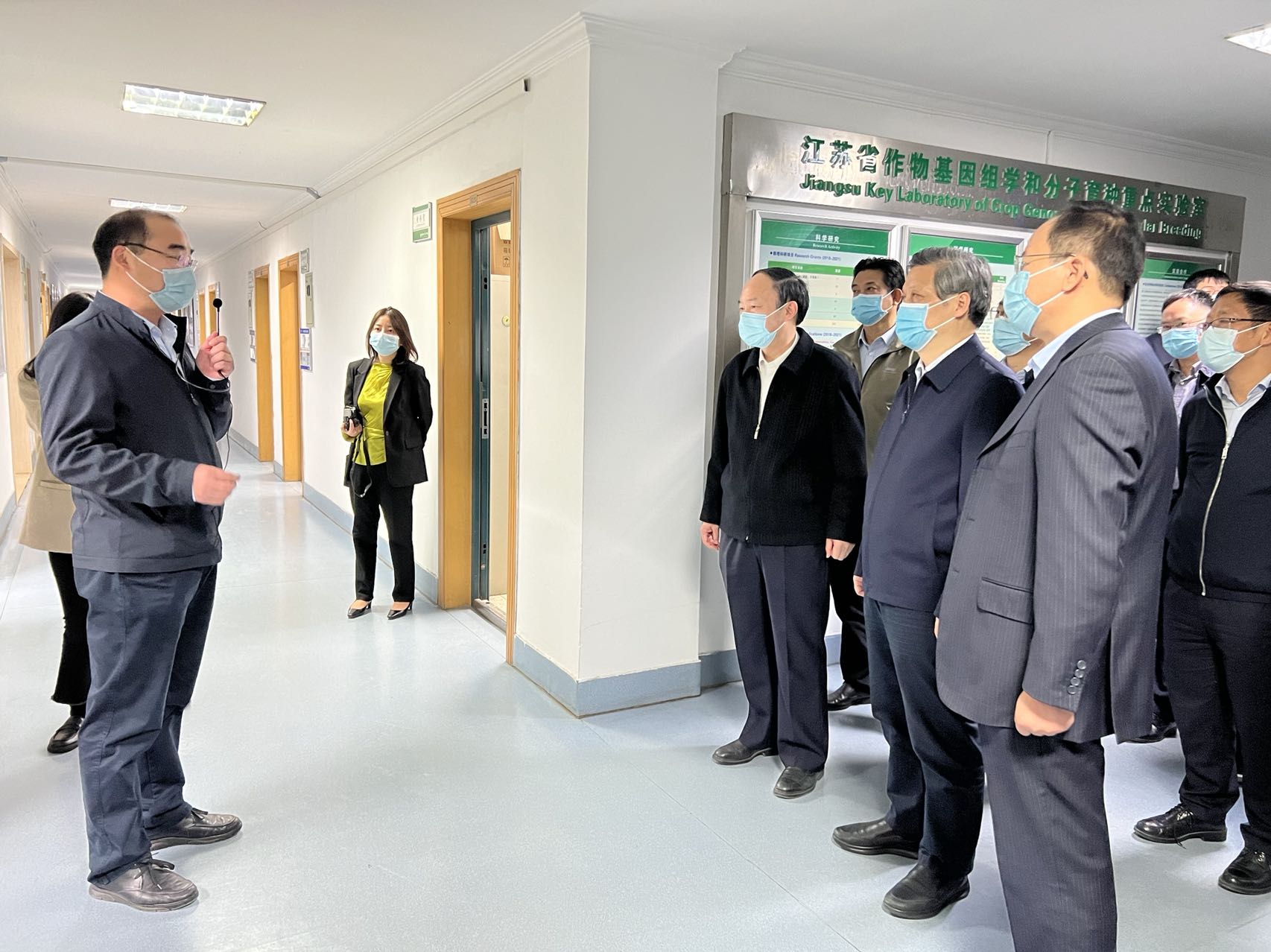 11月16日,扬州市人大常委会主任、党组书记孔令俊调研我院作物基因组学和分子育种重点实验室建设情况。校党委书记焦新安、校长丁建宁陪同调研。扬州市人大常委会副主任、党组副书记韩方,副主任沙志芳、蒋爱祥,党组成员徐祥华,副市长汤卫华,我校副校长赵文明等参加调研。校党办、校办、科技处和我院负责同志参加活动。