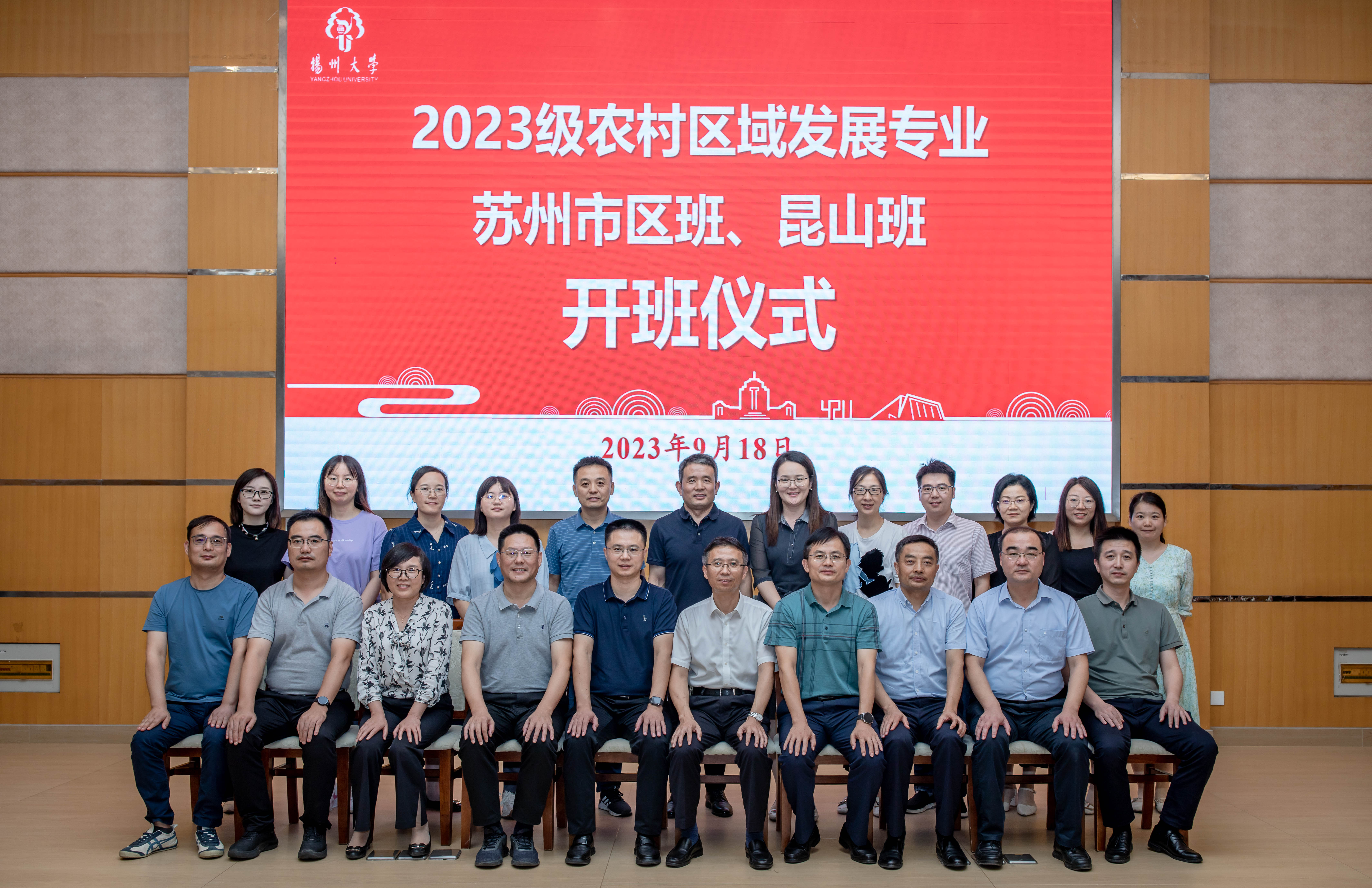9月18日,扬州大学农学院2023级农村区域发展苏州市区班、昆山班开班仪式在荷花池校区多功能厅隆重举行。苏州市农业农村局副局长何建华,昆山市、吴中区、相城区农业农村局等有关部门负责同志,校教务处副处长张来、党委学生工作部(处)副部(处)长周超、招生办公室主任钱厚斌出席仪式。农学院党委书记周保垒、院长杨泽峰及学院领导,院办公室、团委(学工办)负责同志、定向班班主任及全体学生参加仪式。