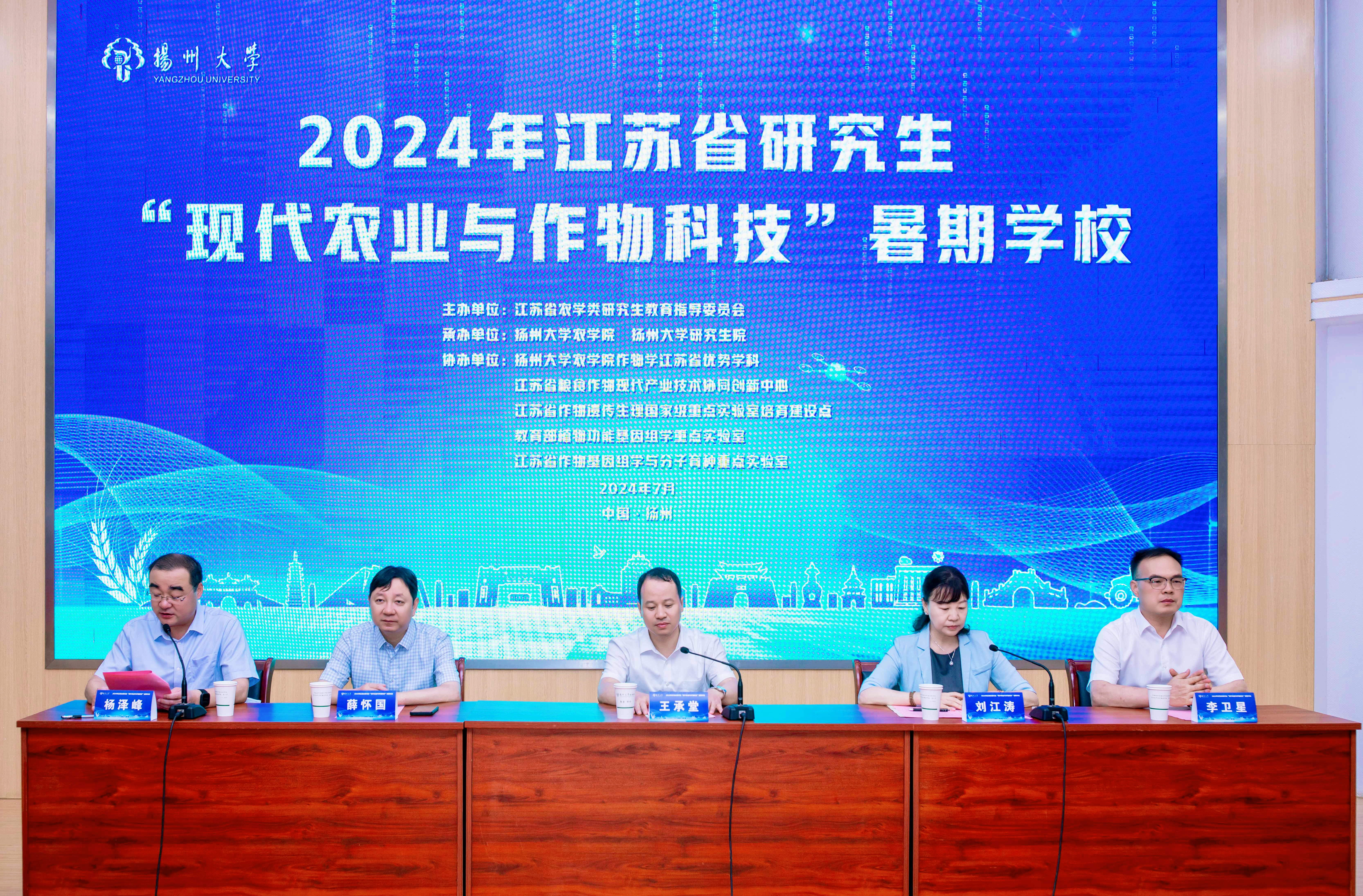 7月11日上午,2024年江苏省研究生“现代农业与作物科技”暑期学校开班仪式在我校逸夫图书馆报告厅举行。江苏省教育厅研究生教育处副处长刘江涛,扬州大学党委常委、副校长王承堂,扬州大学研究生院院长薛怀国,农学院党委书记李卫星、院长杨泽峰、党委副书记周立云、副院长魏海燕,教师代表及班级全体新生参加仪式。