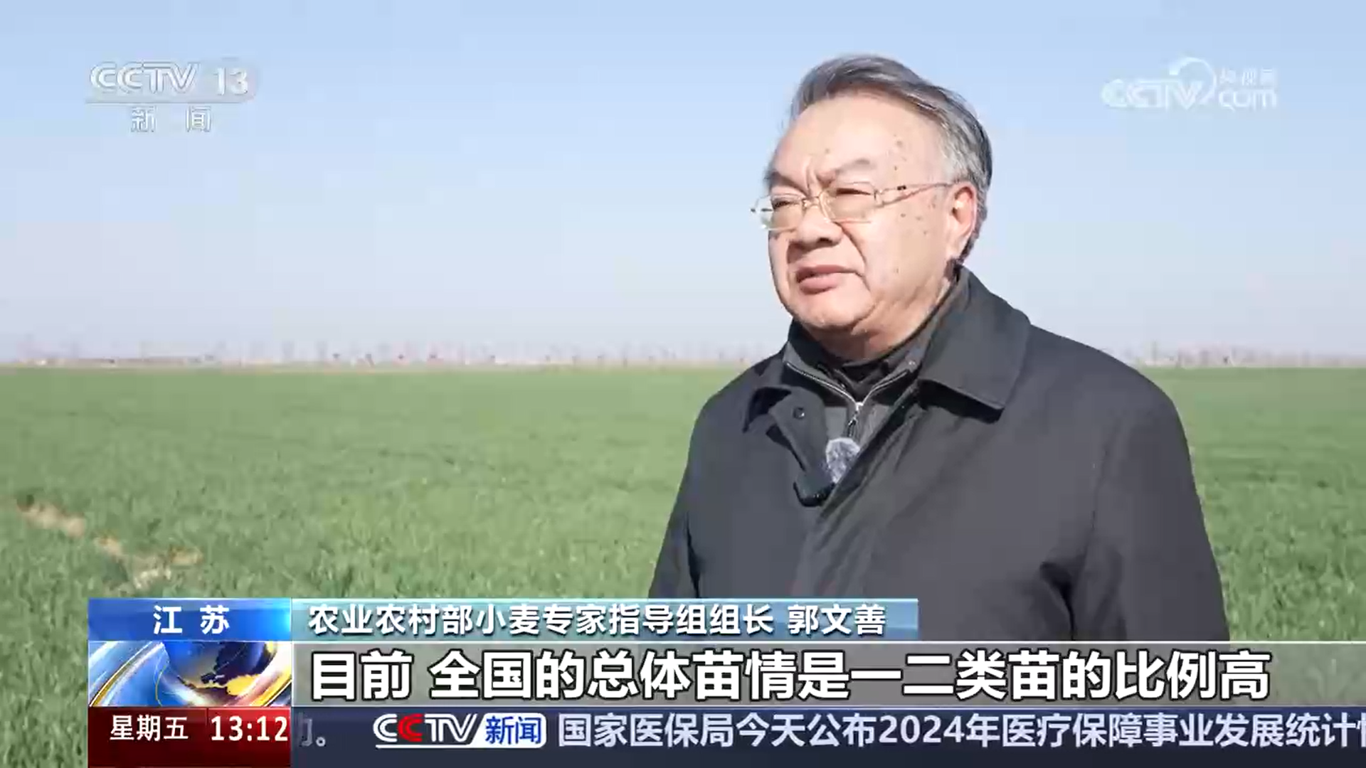 近日,中央电视台《新闻直播间》《正点财经》栏目相继播出我院郭文善教授介绍当前小麦苗情和田间管理措施的采访片段。他表示:“目前,全国的总体苗情是一二类苗的比例高,苗情好于常年,与上年持平,具备丰收的苗情基础。”