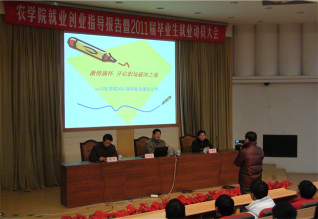 我院隆重举行就业创业指导报告暨2011届毕业生就业动员大会 1月19日上午,学院在逸夫图书馆报告厅隆重举行就业创业指导报告暨2011届毕业生就业动员大会。校党委学生部(处)副部(处)长、校就业指导中心主任杨桂元、仪征团市委副书记、扬州市“十佳大学生村官”郑福源应邀出席并为全体2011届毕业生作就业创业指导报告,院党委副书记生永明同志作就业动员讲话。学院团委(学工办)书记(主任)佴军主持会议。全体辅导员、2011届本科生和研究生同学及所在班级班主任参加该大会。