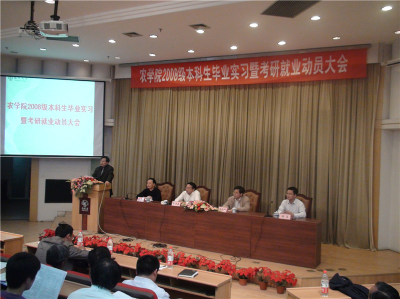 农学院举办2008级本科生毕业实习暨考研就业动员大会 5月6号下午,我院在逸夫图书馆报告厅隆重举行2008级本科生科研与生产实习暨考研就业动员大会。院长郭文善、党委副书记生永明、副院长陆建飞出席会议并分别讲话。团委书记佴军主持会议。各系正副主任、各学科带头人、各实习班级班主任以及全体2008级本科生、部分一二年级学生代表共300余人参加大会。