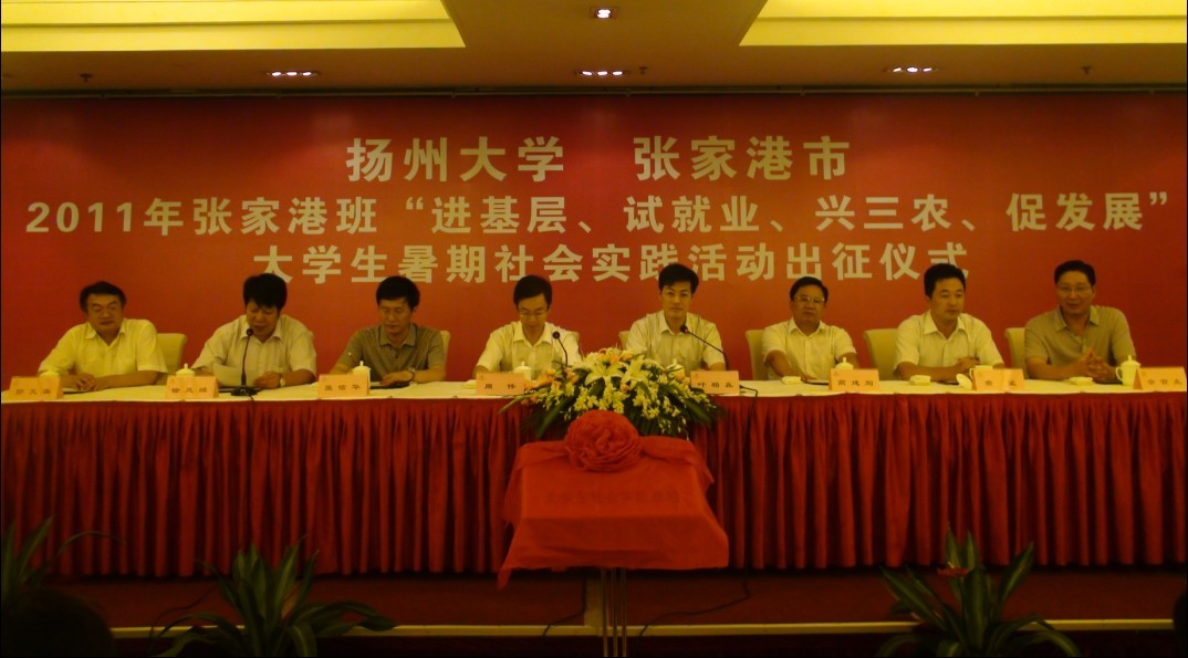 为贯彻落实胡锦涛总书记向青年学生发出的“向实践学习、向人民群众学习”的号召,扎实开展以“红色传承‘九十年’ 青春建功‘十二五’”为主题的暑期“三下乡”社会实践活动。 7月26日下午,扬州大学与张家港市在张家港市区华芳金陵酒店隆重举行2011年张家港班“进基层、试就业、兴三农、促发展”大学生暑期社会实践活动出征仪式。出席此次仪式的学校领导老师有校党委常委叶柏森副校长、校学生处张信华处长、校团委费坚书记、院长郭文善教授、院党委余吉生书记、院党委生永明副书记、农村发展与信息技术系主任、张家港班班主任庄恒扬教授、院办公室陈源主任、院团委佴军书记;出席此次仪式的张家港市领导有市委周伟常委、市人大常委会副主任高建刚、市委办王卫国副主任、市政府办黄建中副主任、市农委徐凤琪主任、市农委徐江副主任、市委农工办顾永福副主任以及各镇(区)分管农业领导和农服中心主任。此外,张家港班全体同学参加了出征仪式。
