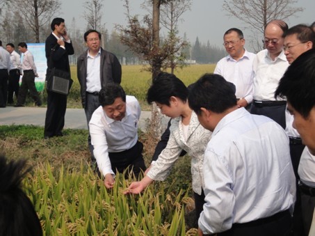 10月17日上午,省委常委、副省长黄莉新来到我院在兴化市钓鱼镇的水稻基地,考察了我院和兴化市共同承担的国家粮食丰产科技工程江苏水稻项目的攻关试验田和我院指导的兴化市钓鱼镇水稻万亩高产增效示范片的水稻生产情况。我院张洪程教授介绍了项目实施的有关技术情况。