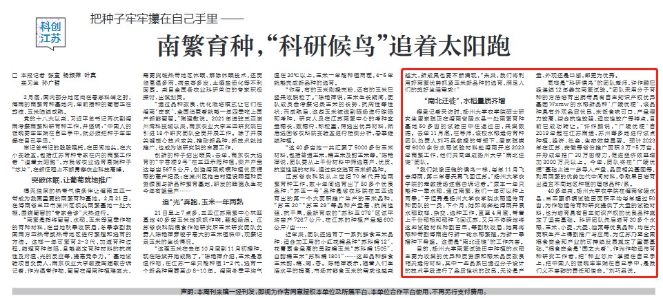 40多年来,扬州大学农学院在海南省陵水县、三亚藤桥镇试验田面积平均每年超过50亩,为作物遗传育种研究提供了大量的试验材料,也为培育具有自主知识产权的优良品种奠定了坚实基础。科研团队先后培育30多个水稻、玉米、小麦、大麦、油菜等优良品种,均在大面积生产上得到推广与应用,为江苏乃至全国粮食安全和产业的可持续发展奠定了重要基础。“粮食安全是‘国之大者’,作为作物遗传育种研究工作者,把‘种业芯片’掌握在自己手上,把中国人的饭碗牢牢端在自己手中,是我们义不容辞的责任和使命。”刘巧泉说。