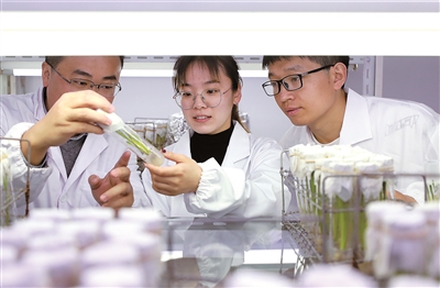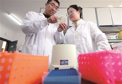 扬州大学农学院青年教师孙生远(左)与博士研究生沈子颜共同观察酵母单杂交实验菌落生长情况。