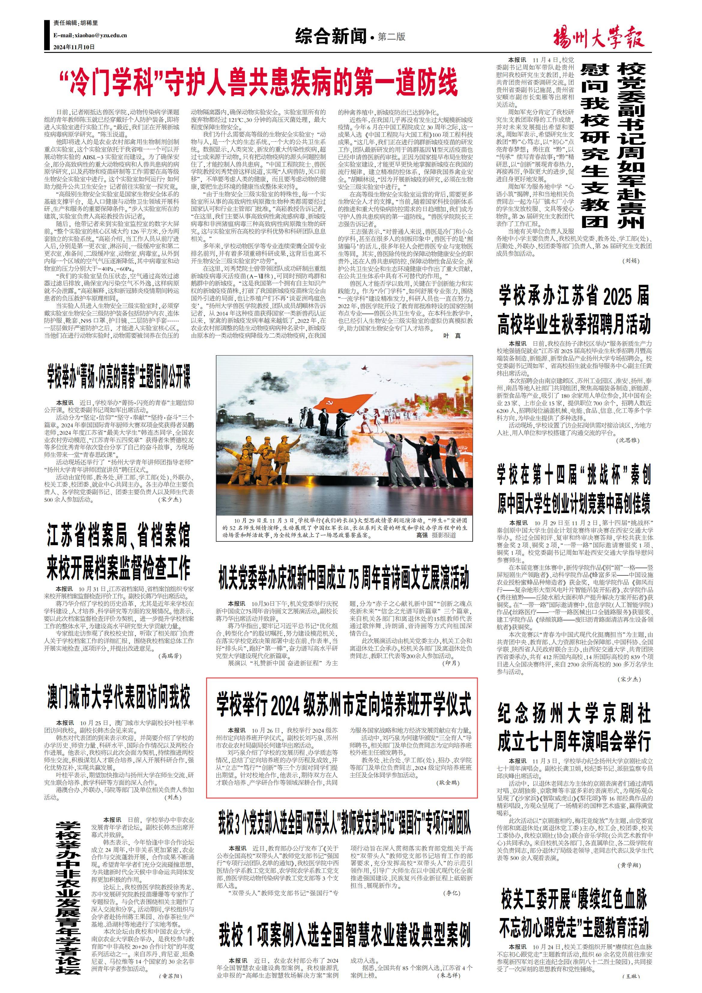 本报讯 10月26日,我校举行2024级苏州市定向培养班开学仪式。副校长刘巧泉、苏州市农业农村局副局长何建华出席活动。