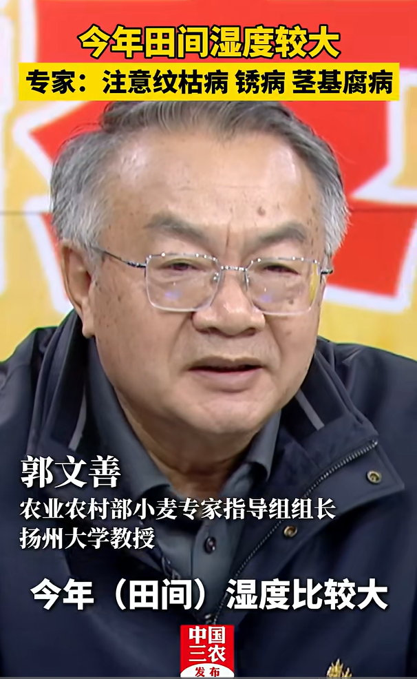 农业农村部小麦专家指导组组长郭文善:今年(田间)湿度比较大,所以像纹枯病、锈病、茎基腐病这些病害,需要引起我们更高的重视。相对于种传或者土传的病害,我们要强化种子包衣或者药剂拌种工作。要及时查虫情、查病情,要早防早治。