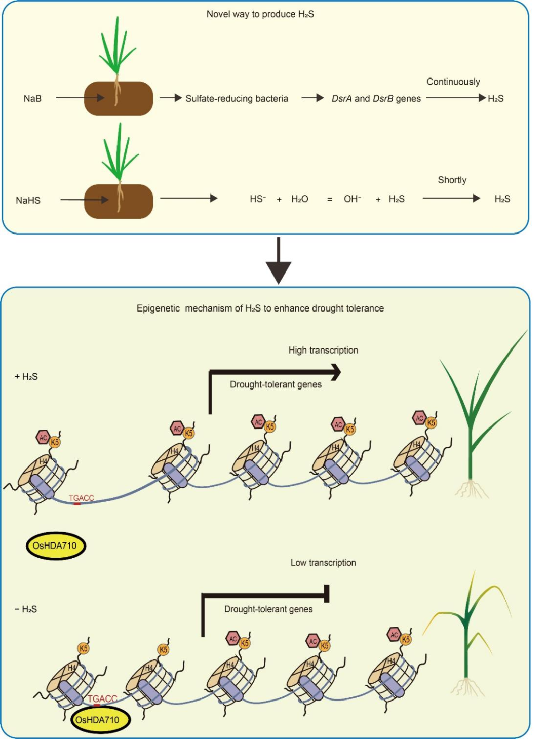JIPB近日在线发表了我院龚志云教授课题组题为“Sodium butyrate regulates the sulphur respiration of rhizosphere soil to produce hydrogen sulfide modulating histone acetylation dynamics to enhance drought tolerance in rice” 的研究论文。该研究发现组蛋白去乙酰化酶抑制剂丁酸钠(NaB)施用在水稻根际后增加了根际土中亚硫酸盐还原菌(SRB)的含量,并导致更多的H₂S释放;进一步发现H₂S特异性抑制组蛋白去乙酰化酶基因OsHDA710的表达,提高抗旱基因启动子中H4K5ac水平。本研究进一步证实OsHDA710可以直接结合靶基因启动子的TGACC基序下调其表达,最终调控水稻幼苗的生长,提高水稻抗旱性。