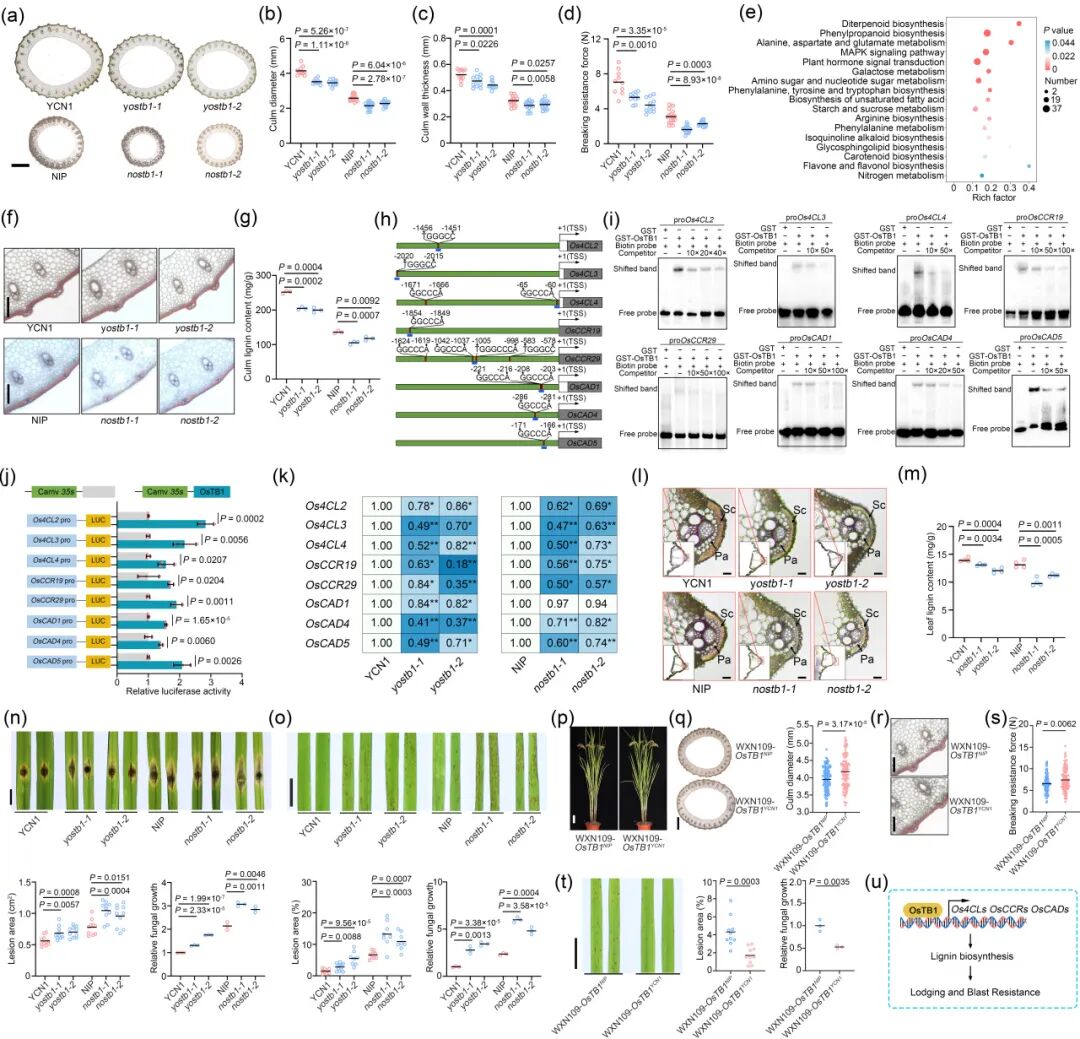 本研究在扬产糯1号(携带高表达的OsTB1YCN1等位基因)以及日本晴(携带低表达的OsTB1NIP等位基因)背景分别创制了OsTB1敲除突变体。研究发现,OsTB1不仅影响茎秆的粗度和厚度,还可能调控茎秆中的组织成分。通过转录组分析以及对木质素的定量检测,发现OsTB1通过调控苯丙烷途径,显著促进木质素的积累,从而增强茎秆强度。为解析OsTB1调控木质素的分子机制,本研究对多个木质素生物合成关键酶的编码基因的启动子进行了分析,并对其中包含OsTB1结合基序的启动子进行了互作验证,发现OsTB1可以直接与多个木质素合成基因(如Os4CL2、Os4CL3、Os4CL4等)的启动子结合。此外,ostb1突变体叶片中的木质素含量也降低。本研究通过穿刺接种和喷雾接种共同鉴定了ostb1突变体的稻瘟病抗性,结果表明OsTB1基因突变导致水稻的稻瘟病菌抗性的下降。