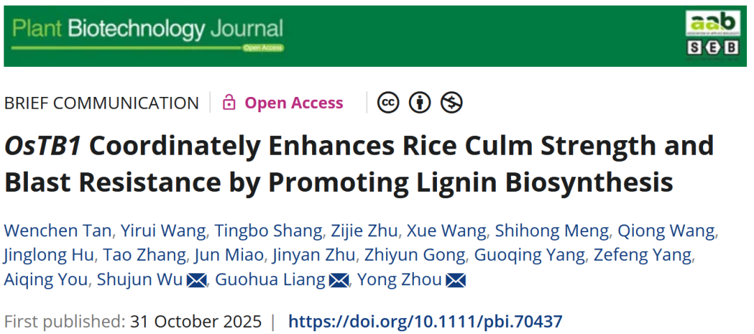 2025年10月29日,国际生物技术著名期刊Plant Biotechnology Journal在线发表了由我院梁国华/周勇团队撰写的题为“OsTB1 coordinately enhances rice culm strength and blast resistance by promoting lignin biosynthesis”的研究论文。该研究发现OsTB1通过调控多个木质素合成基因的表达,增加了细胞壁中木质素沉积,同时提高了水稻对倒伏和稻瘟病的抗性。