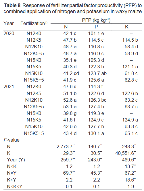 均衡施肥是减少肥料施用量而且提高玉米产量和效率的有效栽培措施之一。近年来,玉米生产中重氮肥而轻钾肥的不均衡施肥现象导致土壤肥力逐年下降。氮肥和钾肥施用量和施用方式对玉米产量和效率的影响已被广泛研究。然而,氮钾肥配施方式对糯玉米产量和氮、磷、钾积累分配及利用效率的影响研究相对较少。